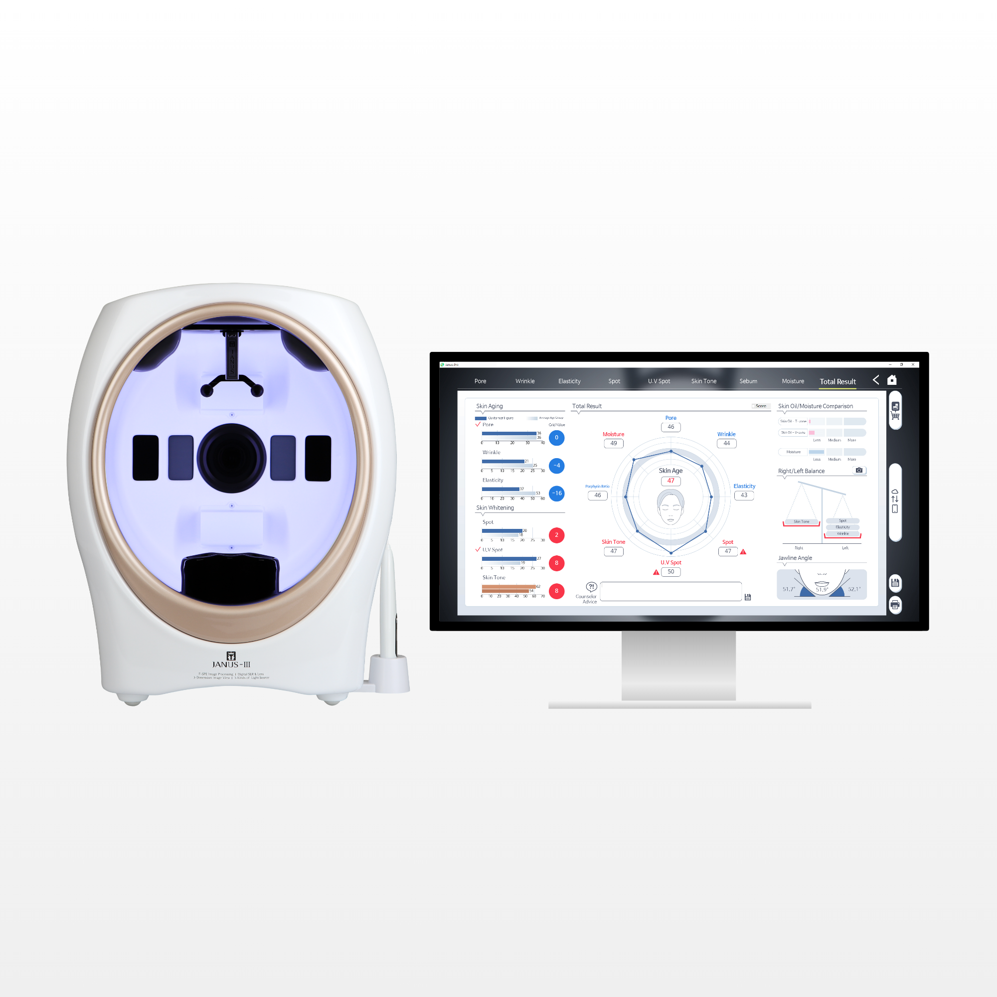 JANUS III Skin Scanner Analyzing Common Skin Problems including Pores, Wrinkles. Elasticity, Brightness, etc for Improvement