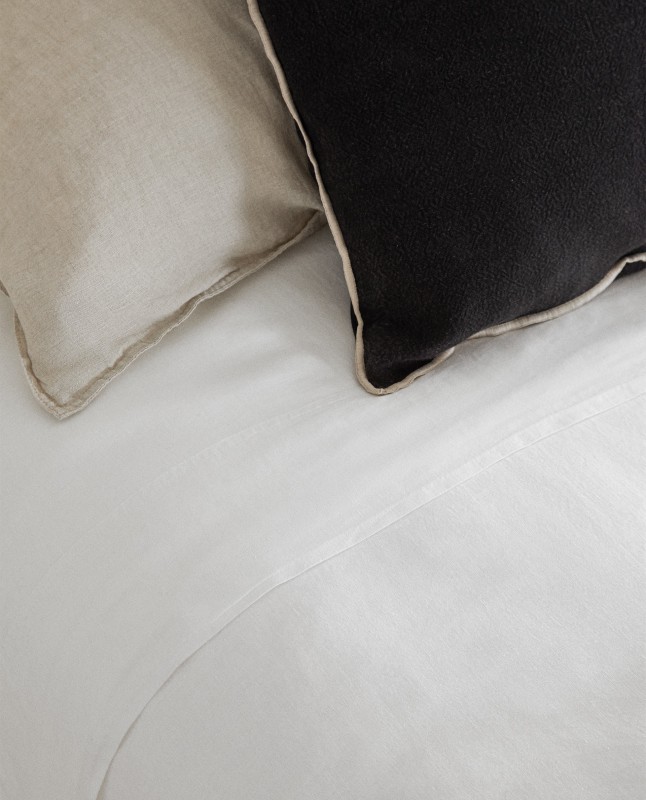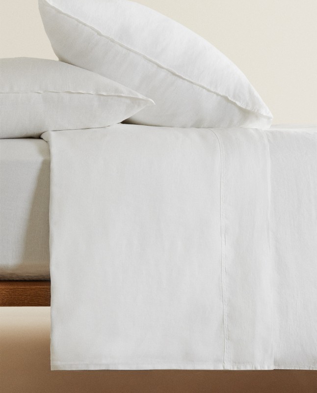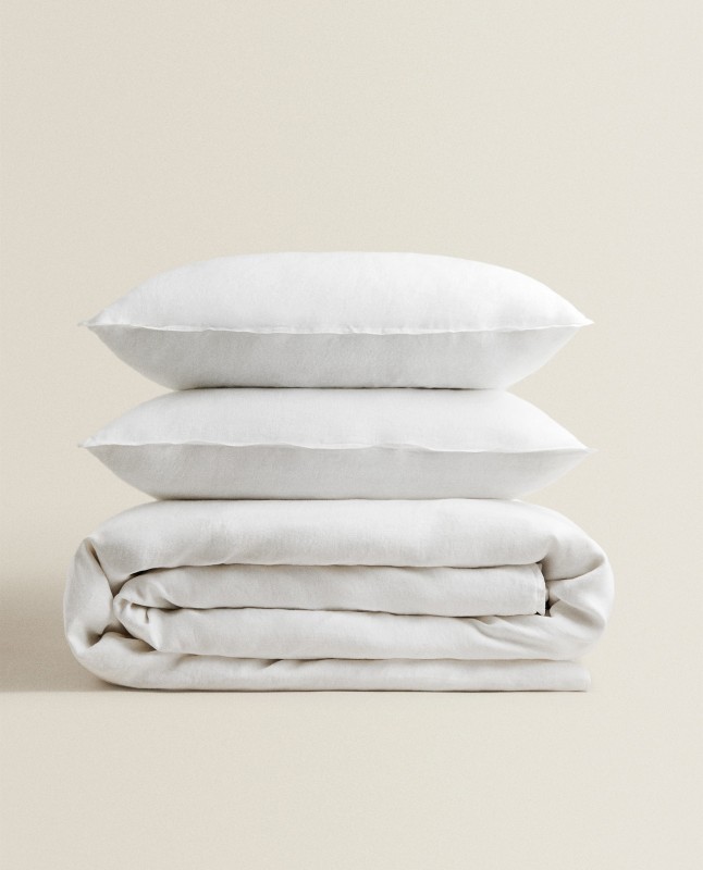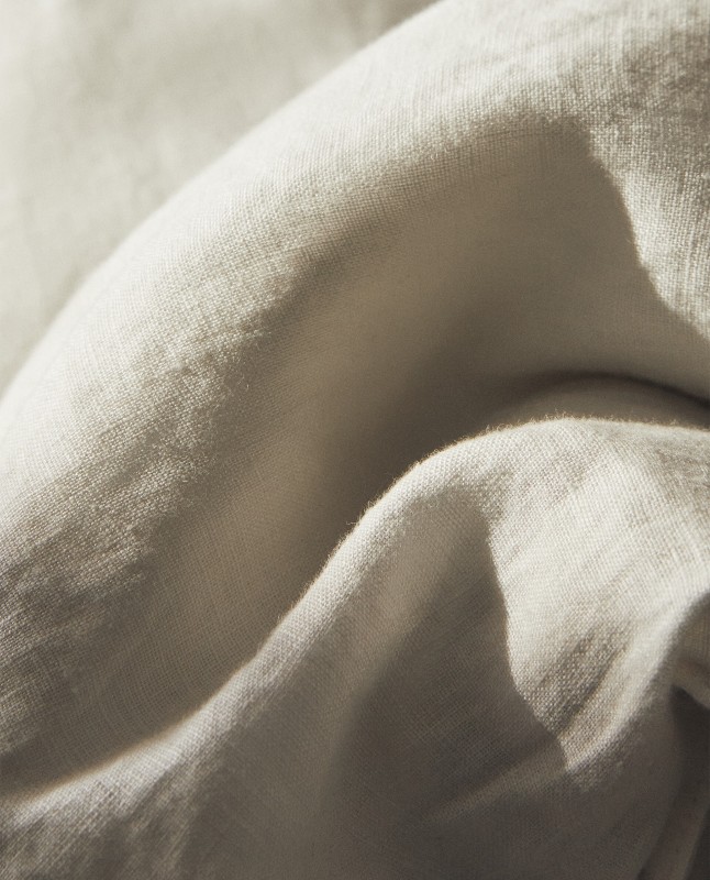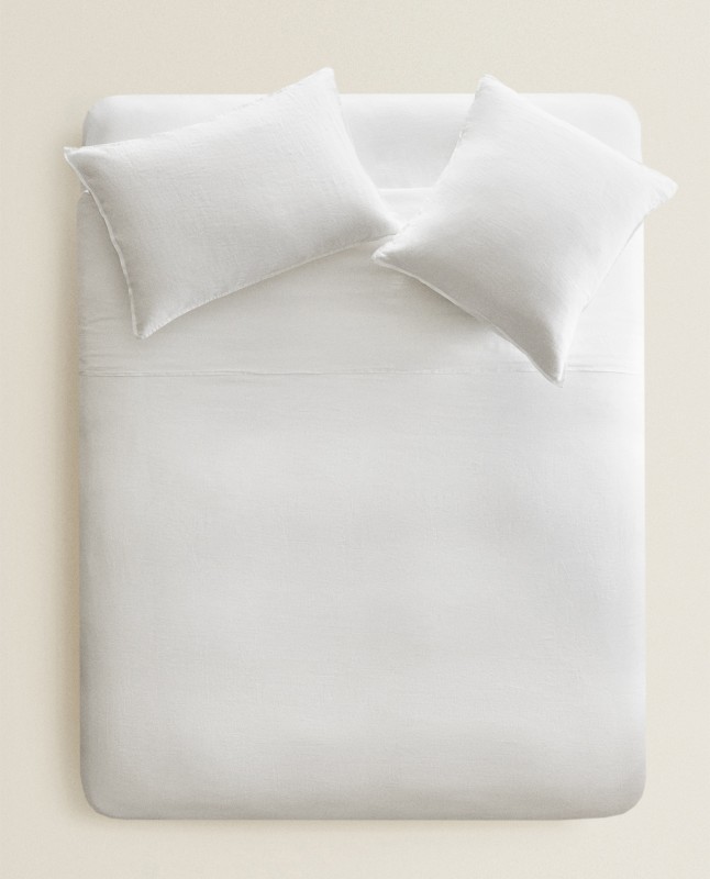 Solid-color 160 GSM washed linen duvet cover with doubletopstitching around the edge.