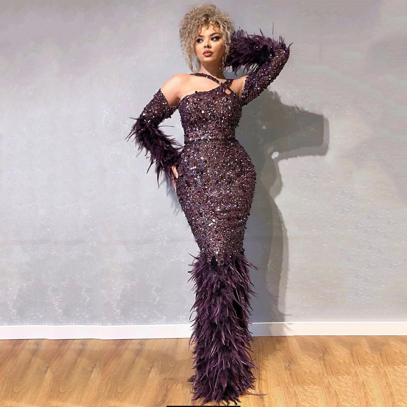 A7377 High End Newest Classic Black Long Feather Sexy Side Cut Long Evening Dresses