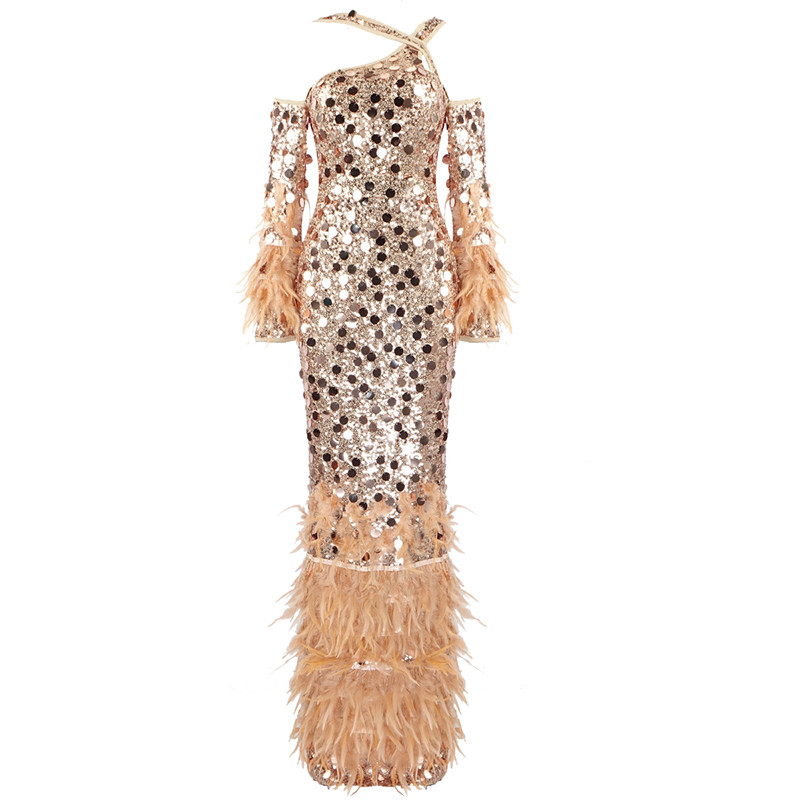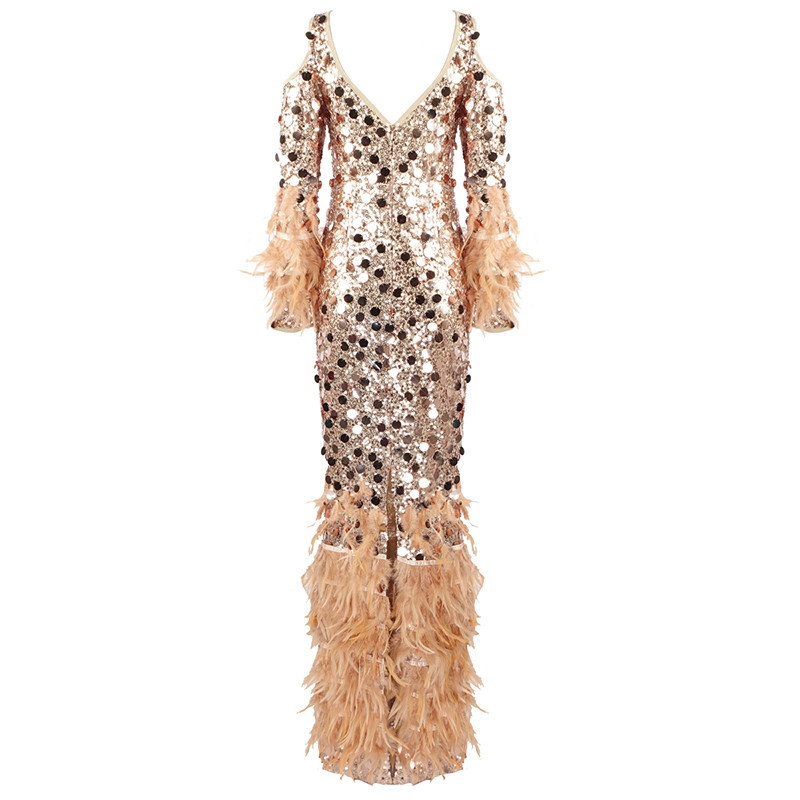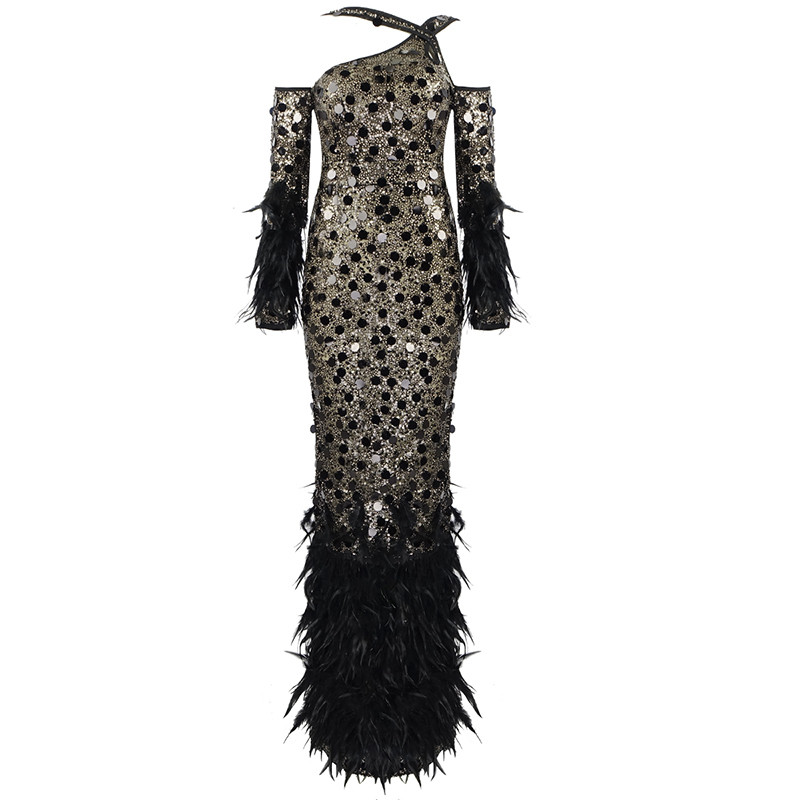 A4568 Fashionable Orange Black Sequins Cutout Feathers Long Women Gown Evening Dress Party
