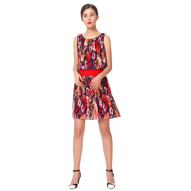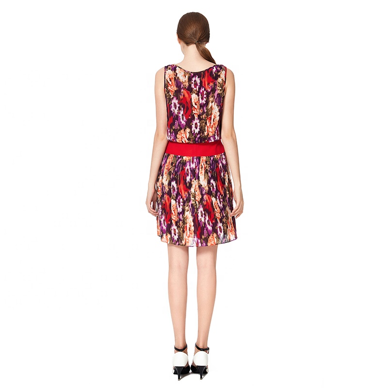 Floral Print Chiffon, All Peice Indeformable Pleat,Boat Neck, Contrast Color Of Waistband Lighting Lightspot And Slim Waist,Retro Classic Cut,Exquisite Workmanship,Loose Fit,Cover