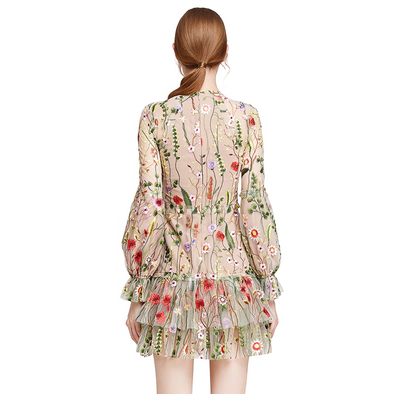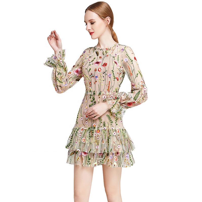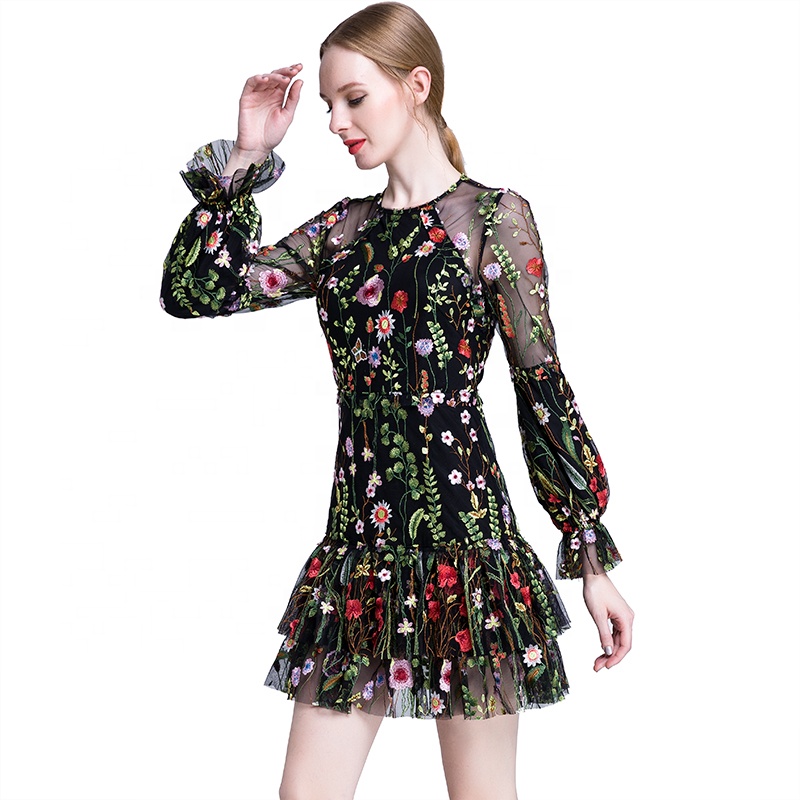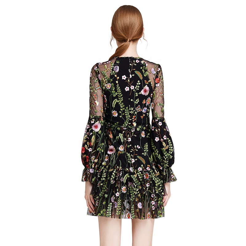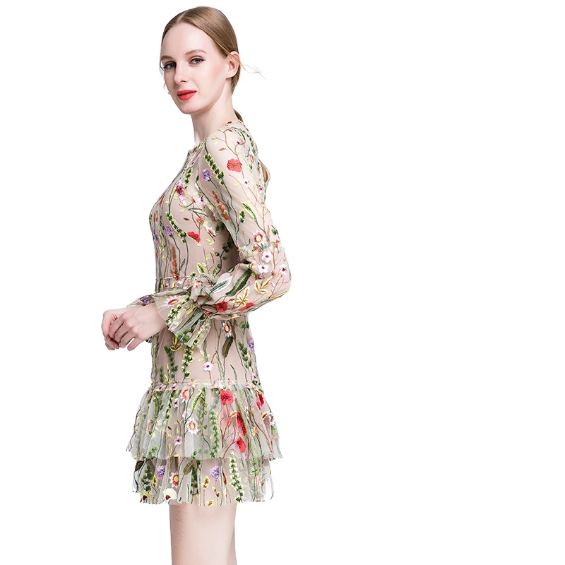 Floral Embroidered Mesh,,O-Neck,Sleeve Opening /Hem With Ruched Ruffles,Neck /Bodice Small Panel /Waist / Top