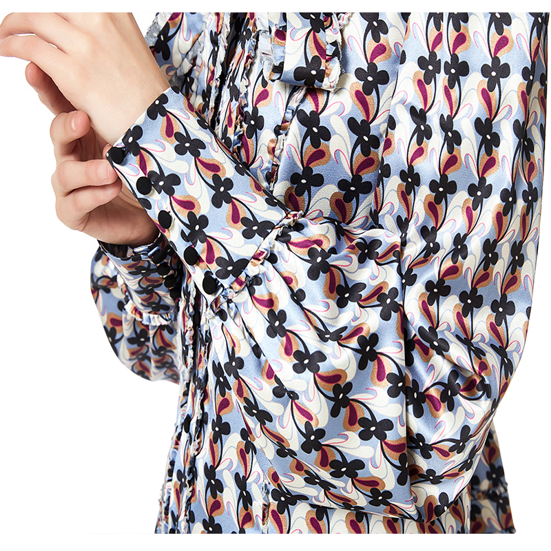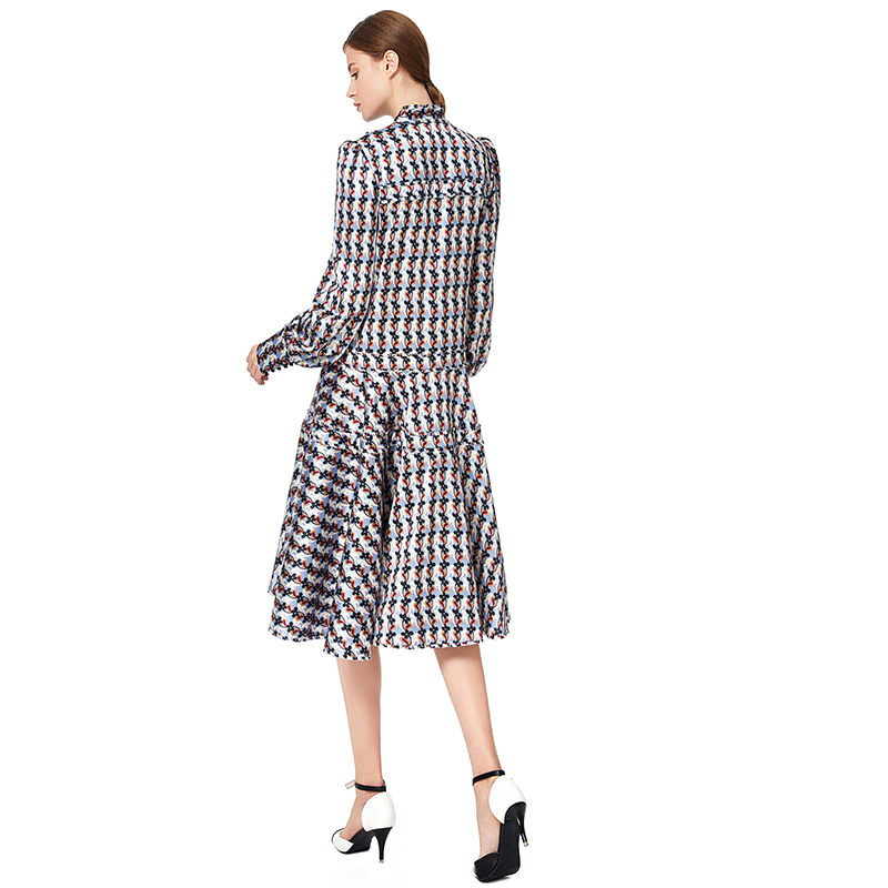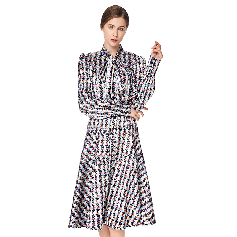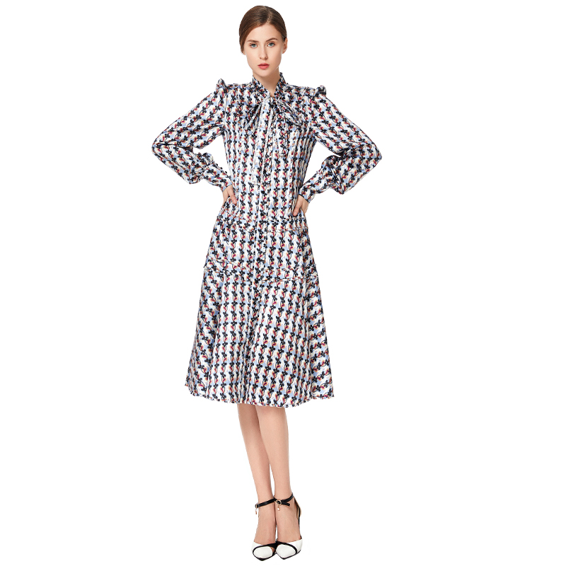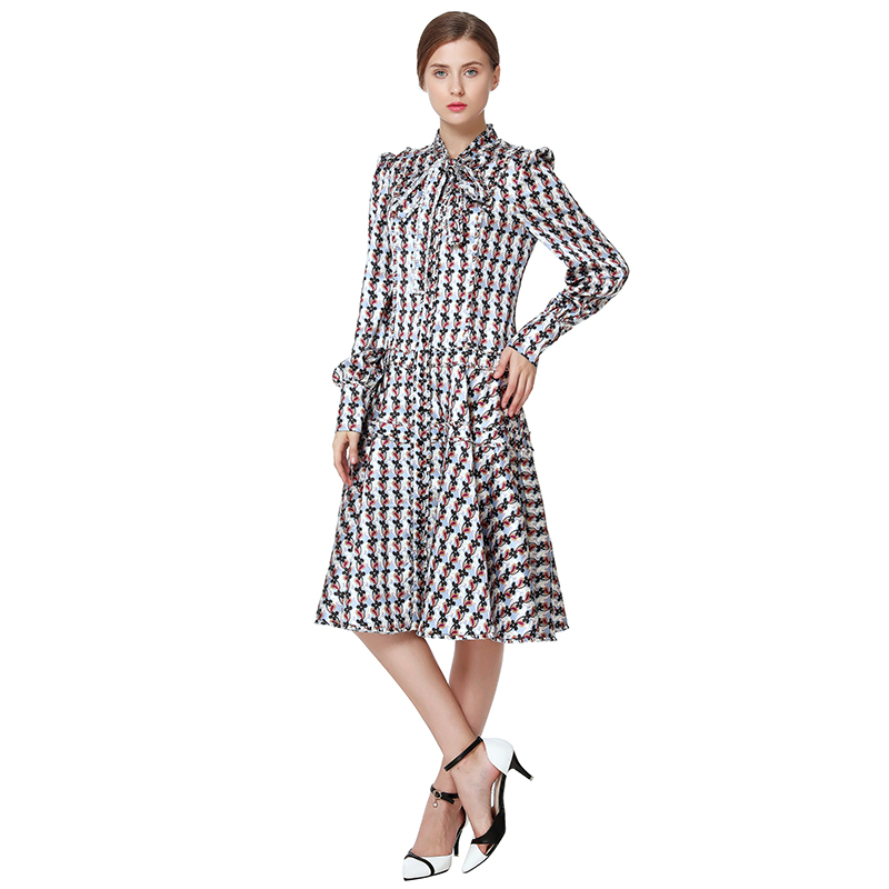 Colorfull Floral Print, Ruffle Sash O-Neck,Long Ruffle Sash For Bow,Flare Skirt Bringing Vitality And Loveliness, CF Placket With Botton Closing, Neck/Long Sash/CF Placket/Hip Facing With Gathering Lace,Front Princess Seam/Hem Sewn
