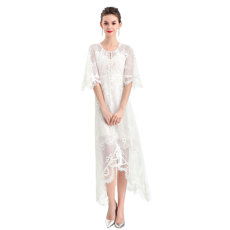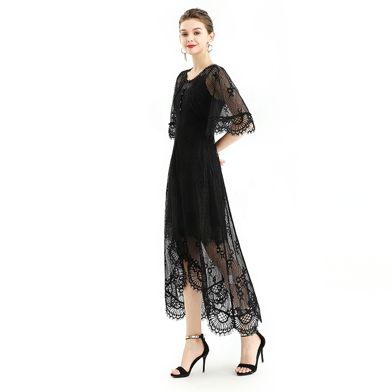 O-neck sexy,Eyelash scallop of ruffle hem/sleeve opening, Neck/ armhole/ sleeve opening sewn lace bringing most lightsopt,High low irregular hem,CF split by botton closing on bodice, Waist seam for slim waist, CF/CB seam,Ball gown flare skirt covering belly and bringing gliding feel. Loose fit flare long dress.