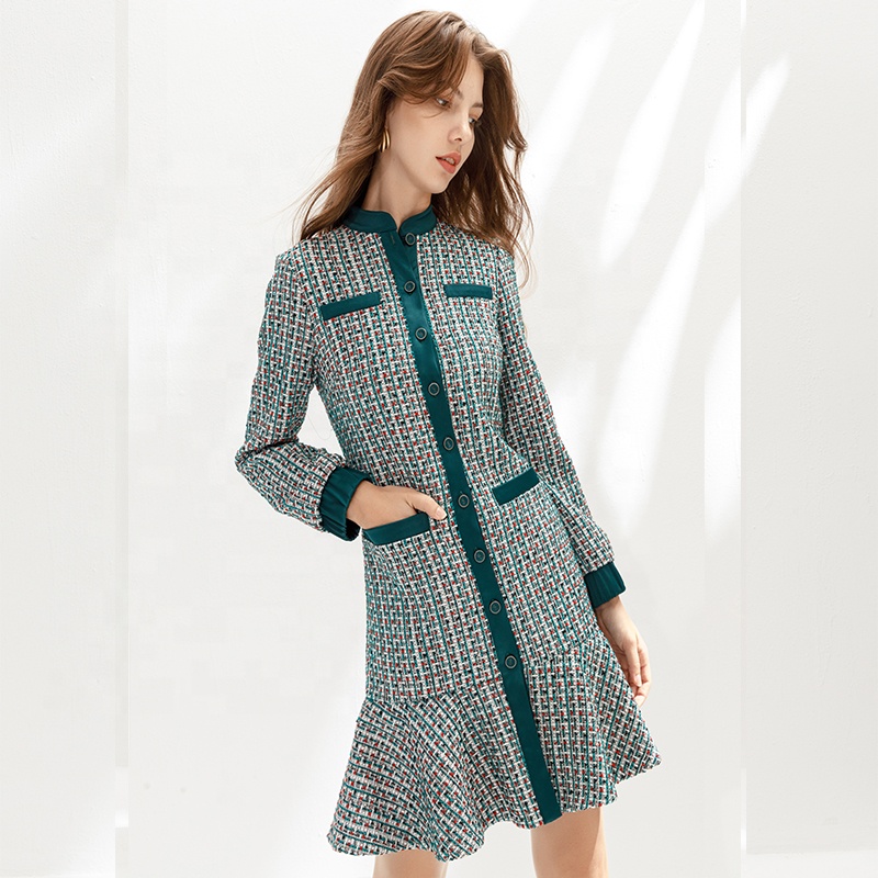 *Design: Multicolored plaid,Long sleeve,Stand collar,Ruffle flare hem achieved gliding feeling,Contrast color of collar/placket/welt/sleeve cuff/hem facing to expel monotonous, Breast welt pockets/front welt pockets for posing and useful,CF placket button closing,Elastic band for sleeve opening adjustment, Back waist darts for slim waist,Contrast color of silky soft full lining,Loose fit,Above knee-length mini dress showing sexy long leg,Exquisite workmanship,Retro classic cut,Fashion and casual,Slim and tall,Gliding and energetic,Sexy and attractive,Sweet and younger,Elegant and tasteful, Intellectual and modern