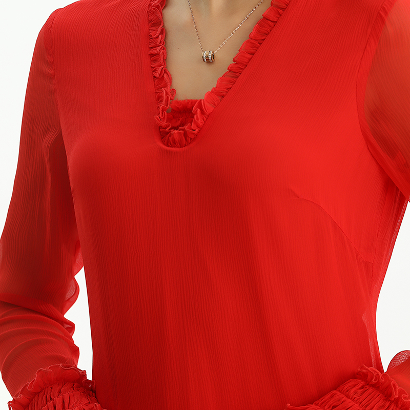 V-neck,CF neck with ruffles,.Soft breathable lining.Bodycon fit flare long dresses.