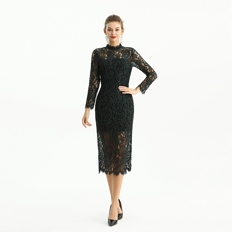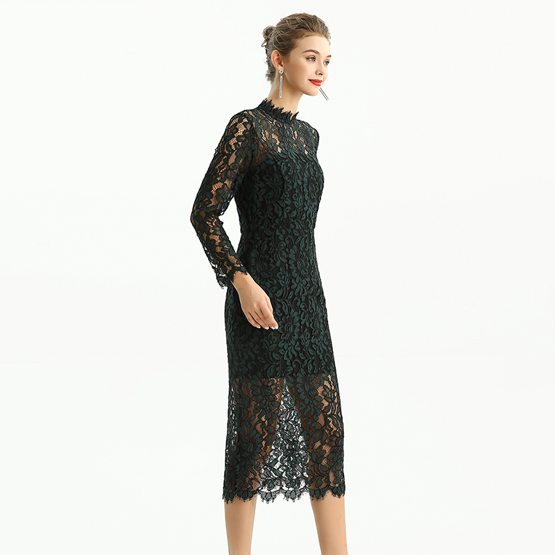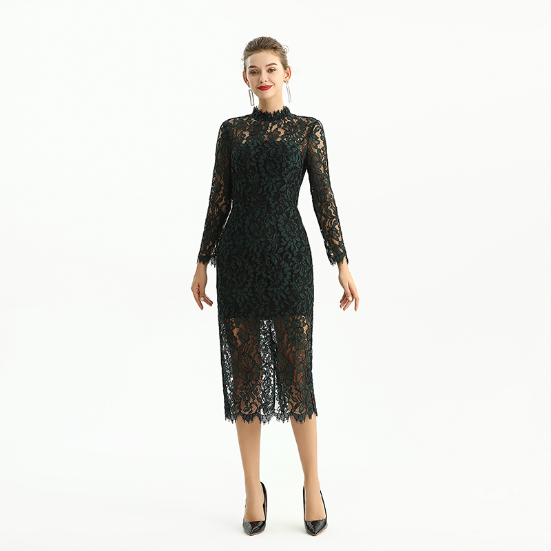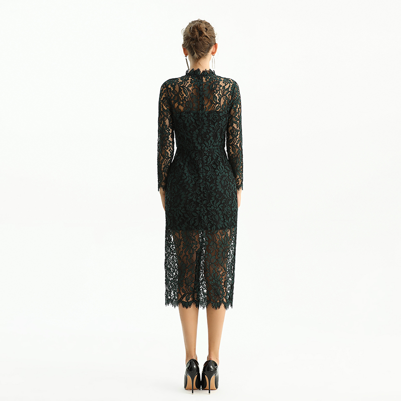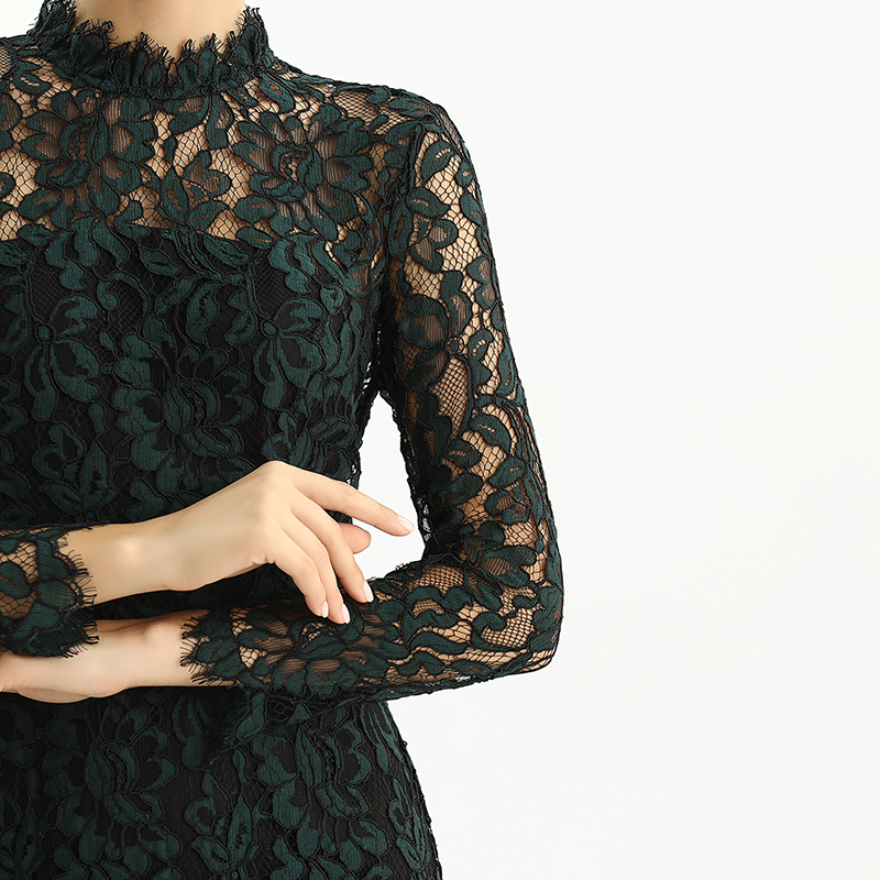 Lace With Ramage,Sheer Hollow Out Lace,O-Neck,Ruched Front Neck,Ball Gown Flare Skirt Achieved Gliding Feeling,Hem And Sleeve Opening Eyslash Scallop Bringing Lightspot, CF/CB Seams On Bodice, Waistband For Slim Waist,Contrast Color Of Lining On Bodice Expelling Monotonous, Mached Color For Skirt Lining.