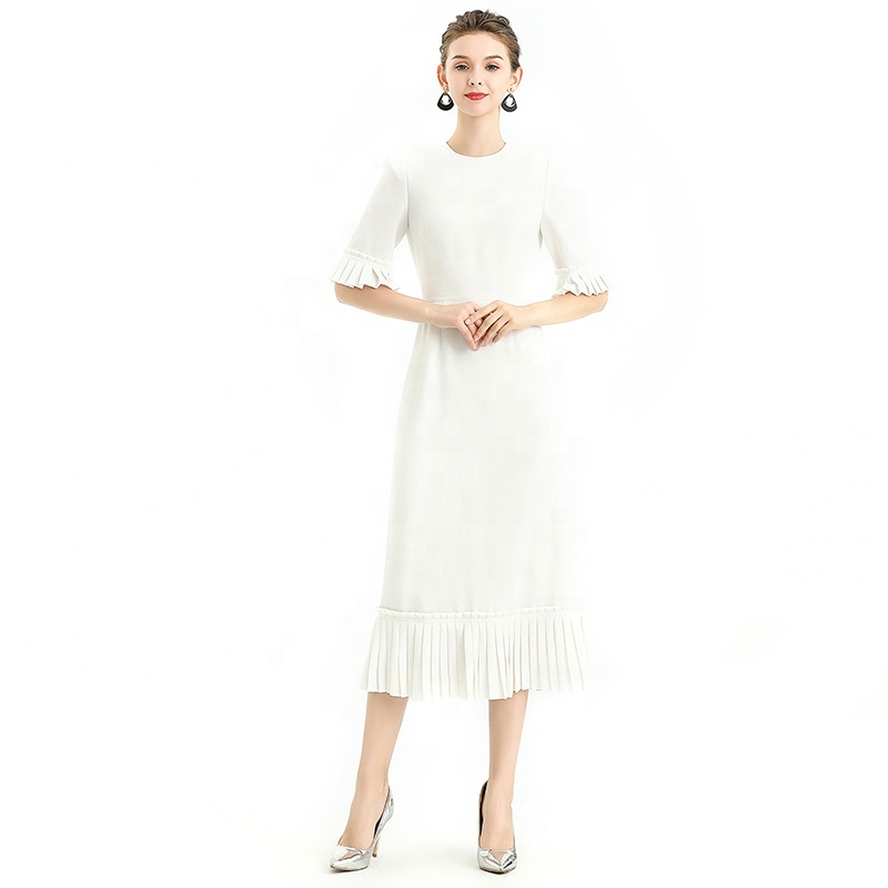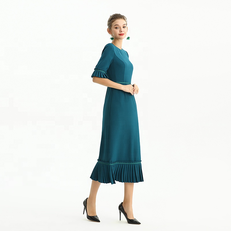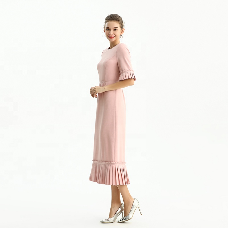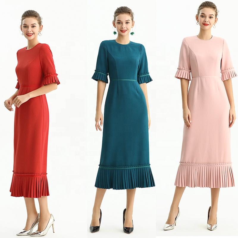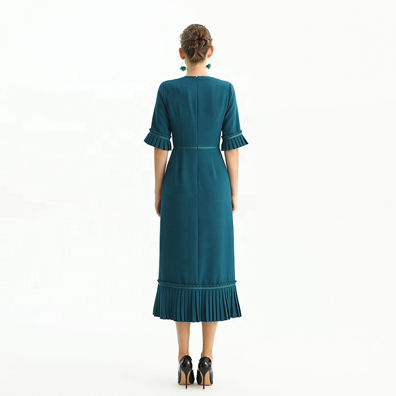 O-neck,Pleat ruffle hem/sleeve opening lighting most lightspot, Neck/waist/hem/ sleeve opening sewn grosgrain tape,Waist seam/back darts for slim waist,Front/Back waist darts at skirt waist,Straight slim fit midi Dresss showing charming body. Soft breathable lining.