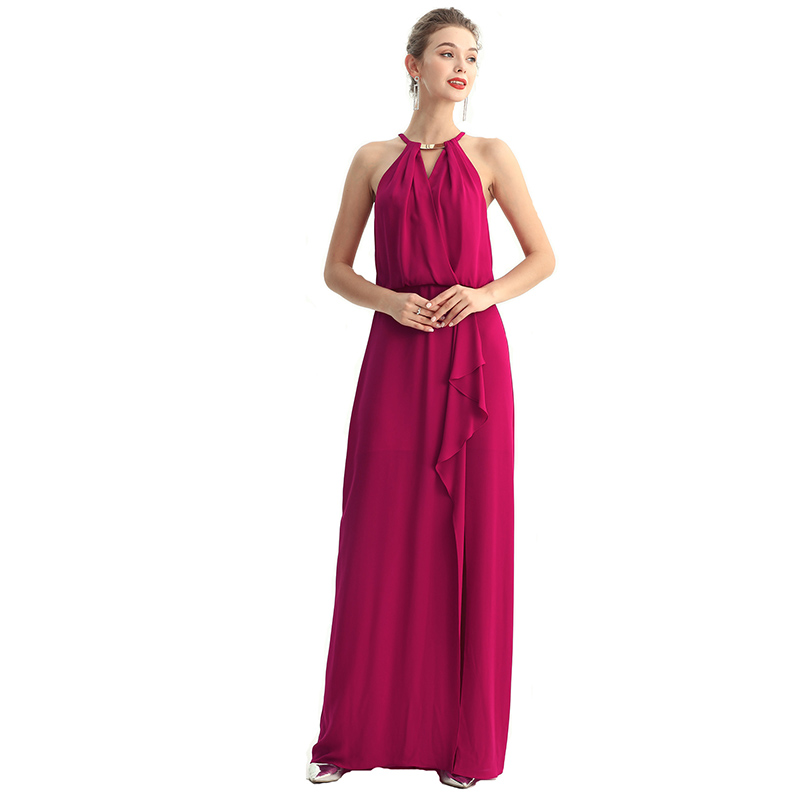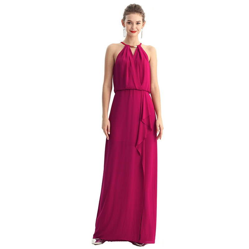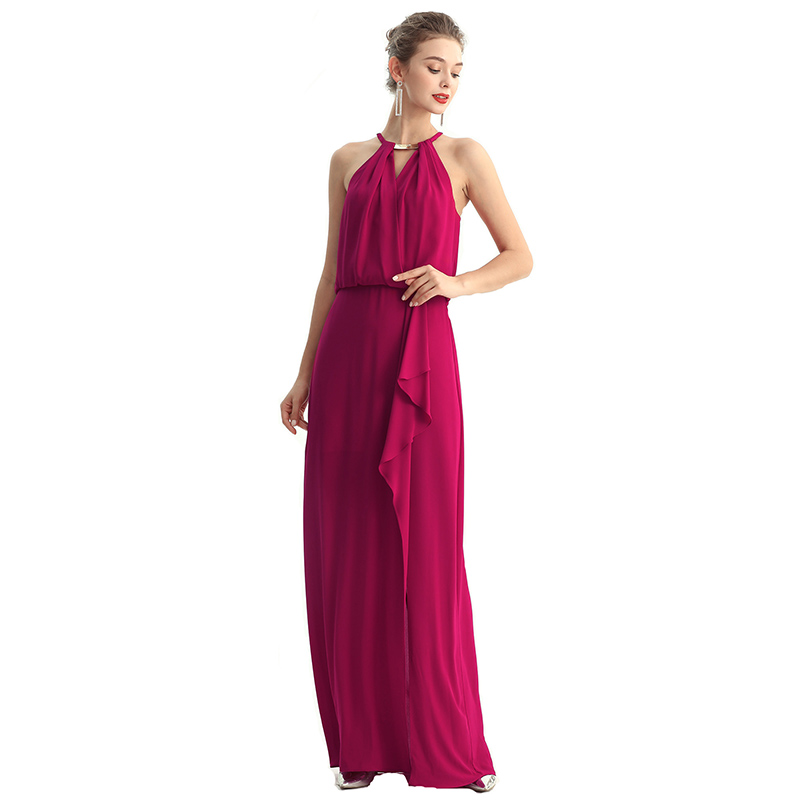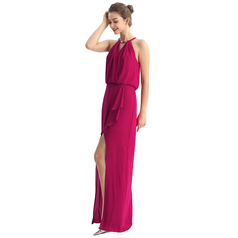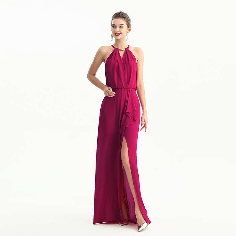 Solid Color, Halter Neck,CF Neck With Golden Steel Ring Keeping Shaped And Lighting Lightspot, Overlap Deep V Neck Sexy,Pleat Front Shoulder, Flounce At Back Bodice /Front Skirt Achieving Gliding Feeling,High Thigh Split Bringing Most Sexy,Half Lining. Bodycon Bodice Slim Waist,Straight Skirt,Floor Length Maxi Long Dress.
