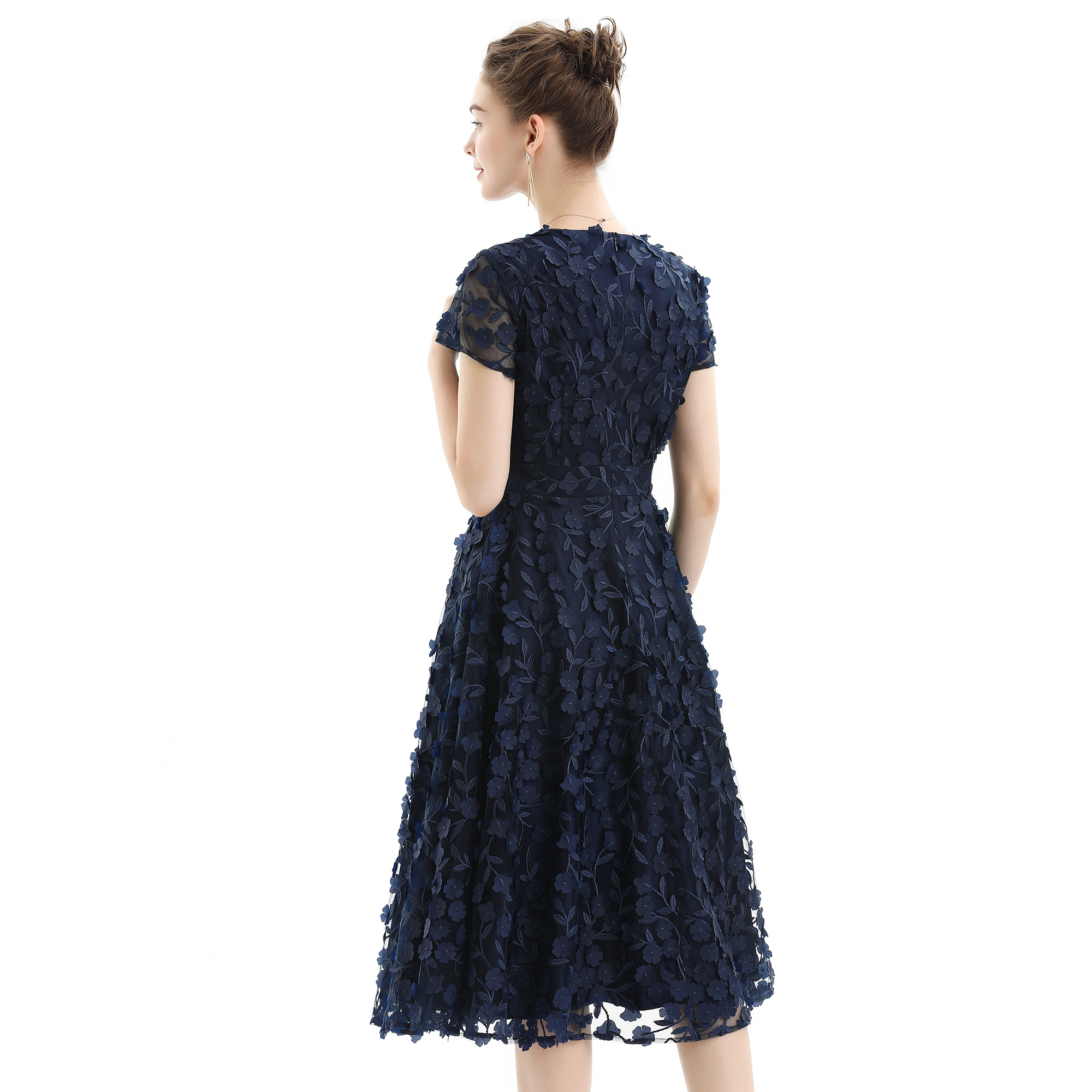 Deep V-neck sexy,Front princess seams shaped bust,Waistband /back waist dart slim waist,Ball gown flare skirt covering belly and bringing gliding feel and most lightsopt,Silky soft stretchy lining for body without sleeve. Bodycon bodice flare midi dress showing charming body