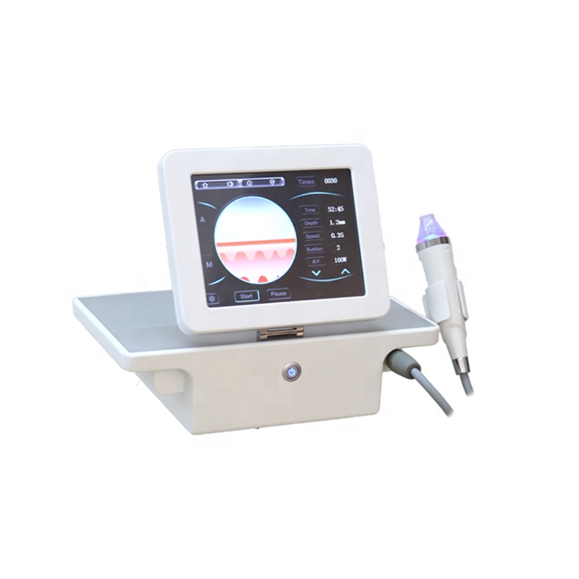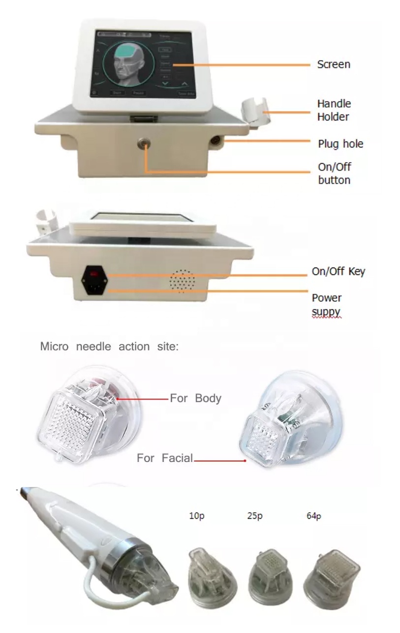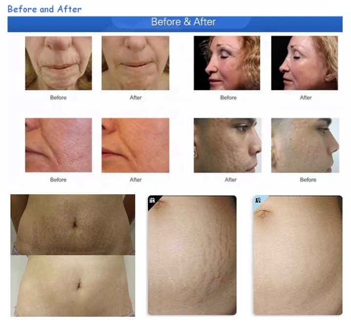 Fractional RF needle system through the special design of many fractional needle point array, the high speed digital motor controls order through the epidermis and the dermis accurate to control the depth of 0.25-3 mm,again by the end of lattice needle release RF,stimulate collagen and elastic tissue,and is not themal damage skin layer potentical.When skin tissues through this process,the epidermal layer is safe,RF energy can well to penetrate to the dermis,stimulate collagen protein hyperplasia,not only is the best way to improve the scars,but also long-term tightening skin wrinkles induced the good method. Cryo helps SRF and MRF play its function.