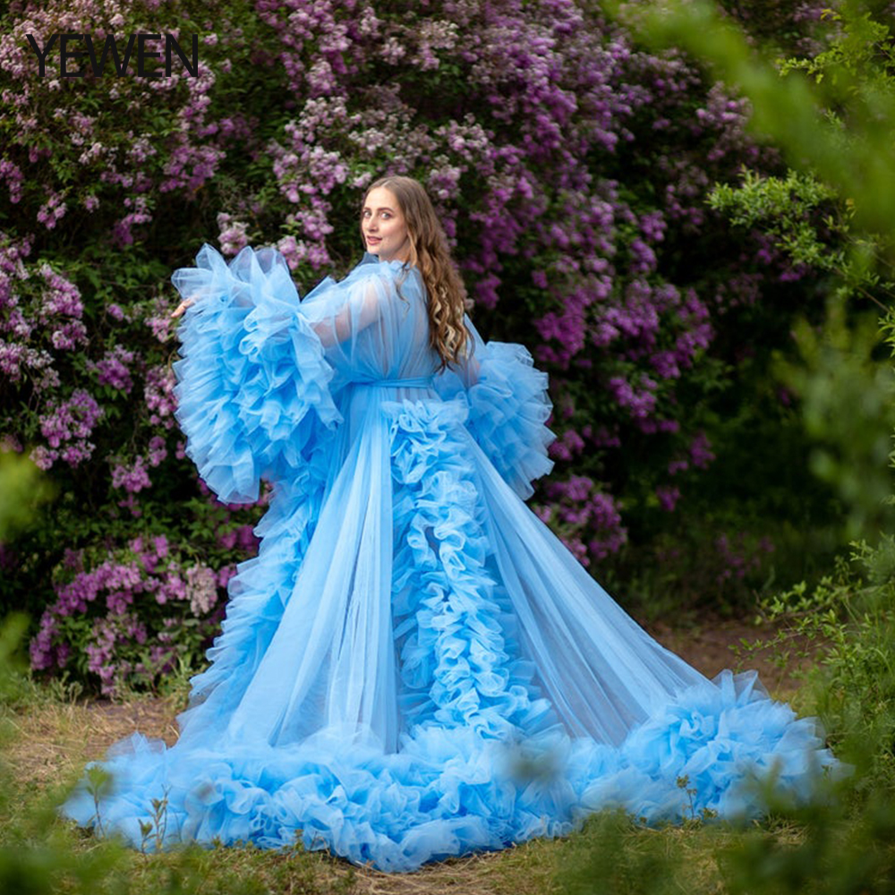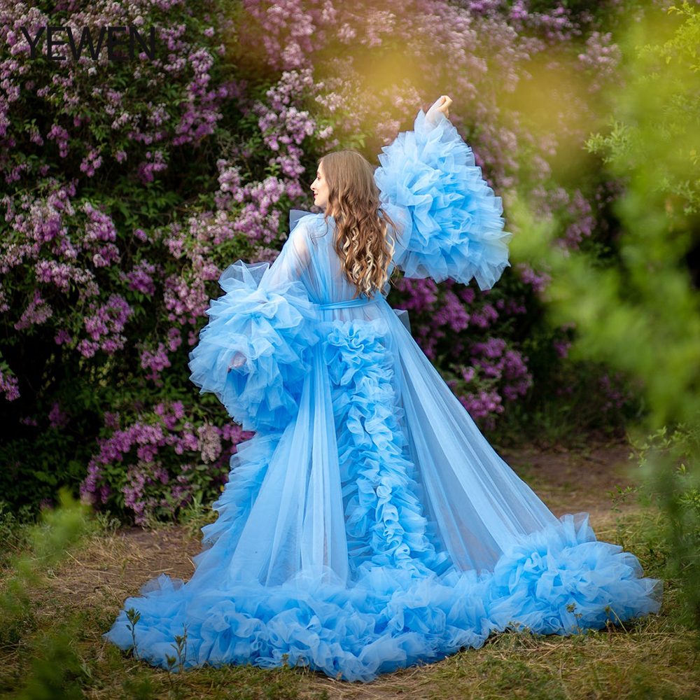 Sexy Blue Tulle Maternity Dresses For Photoshoot See Thru Long Puffy Sleeves Nightgown Photography Pregnancy Women Dresses