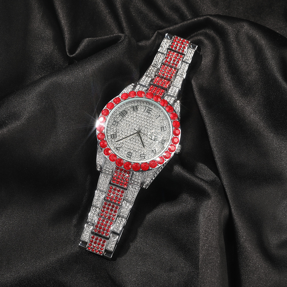 Luxury Stainless Steel Quartz Watch Relojes Hip Hop Gold Plated Rhinestone Wristwatch Icy Red Diamond Quartz Watch For Women