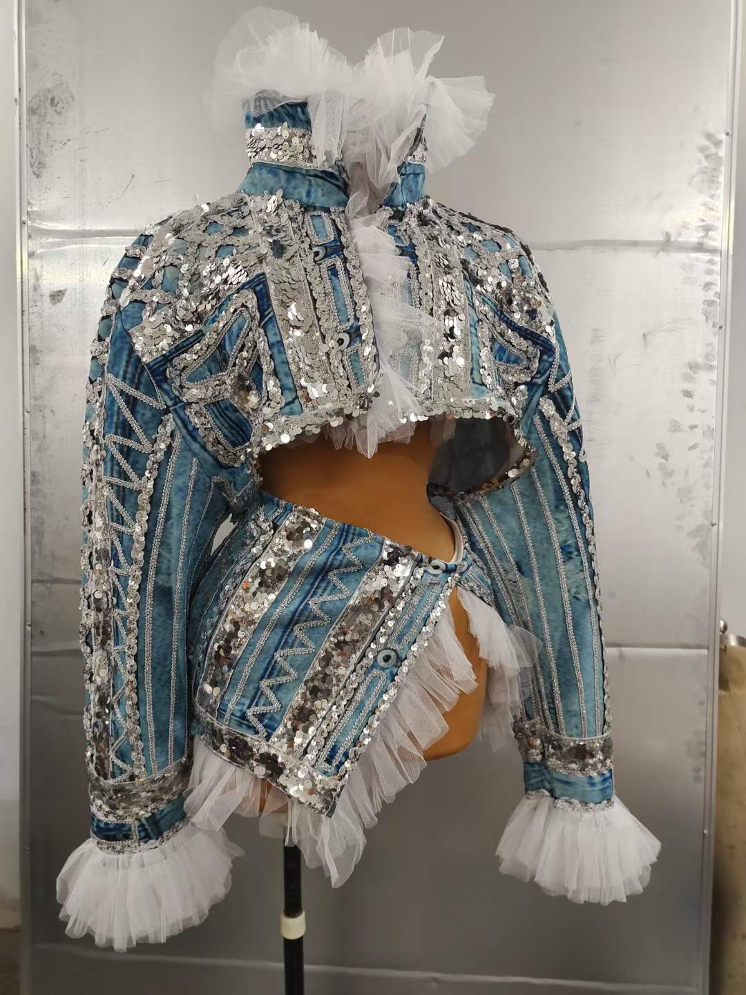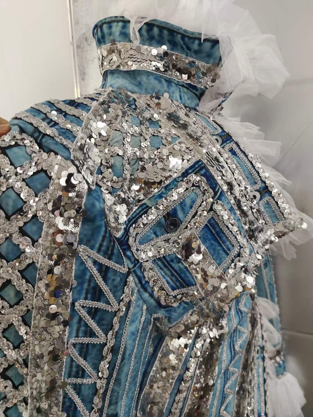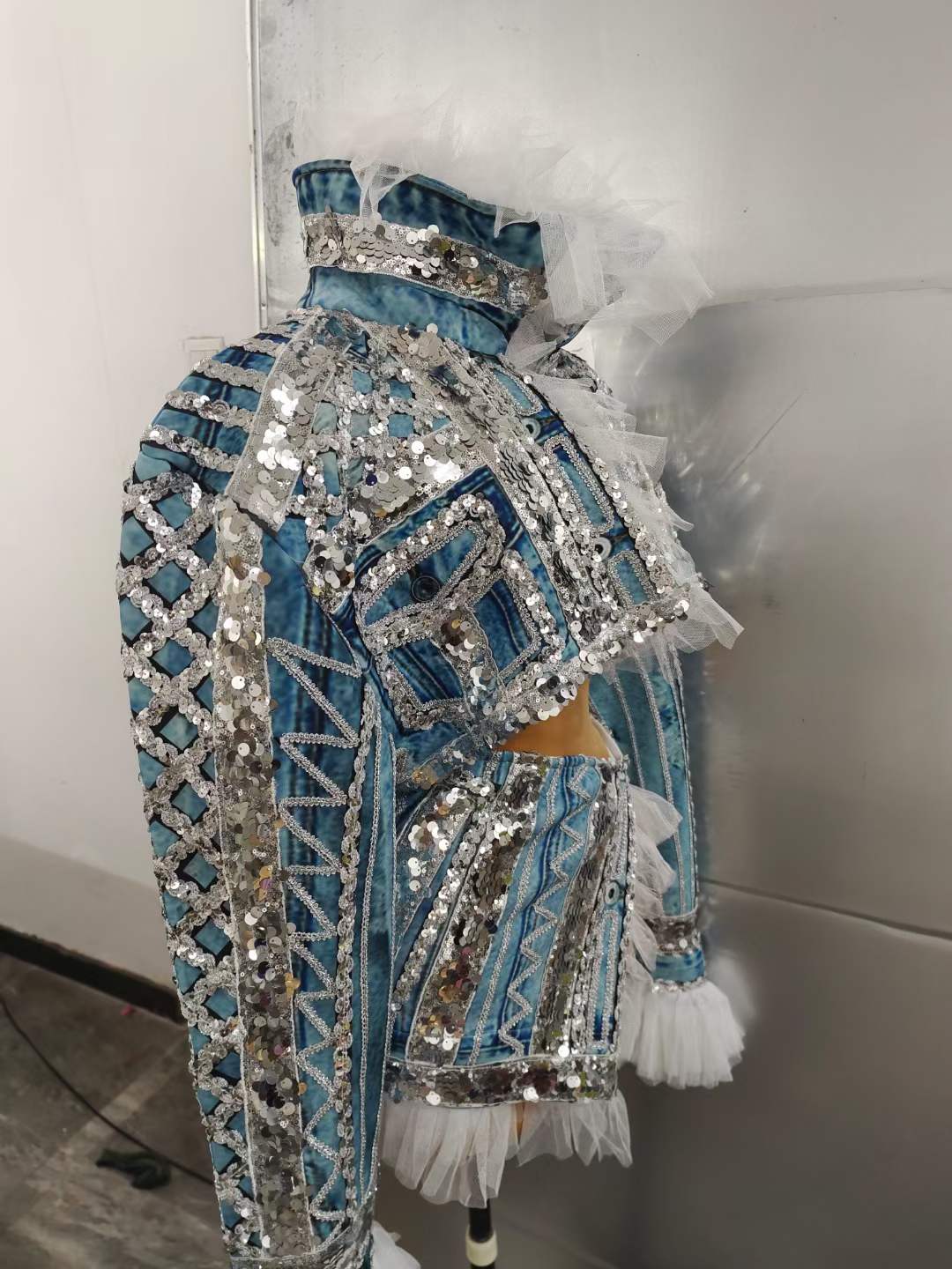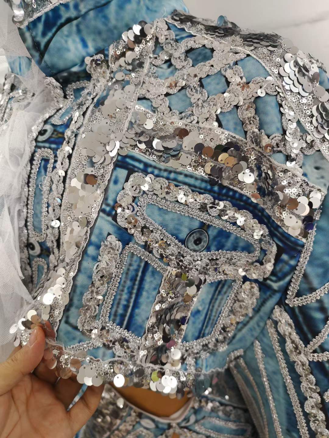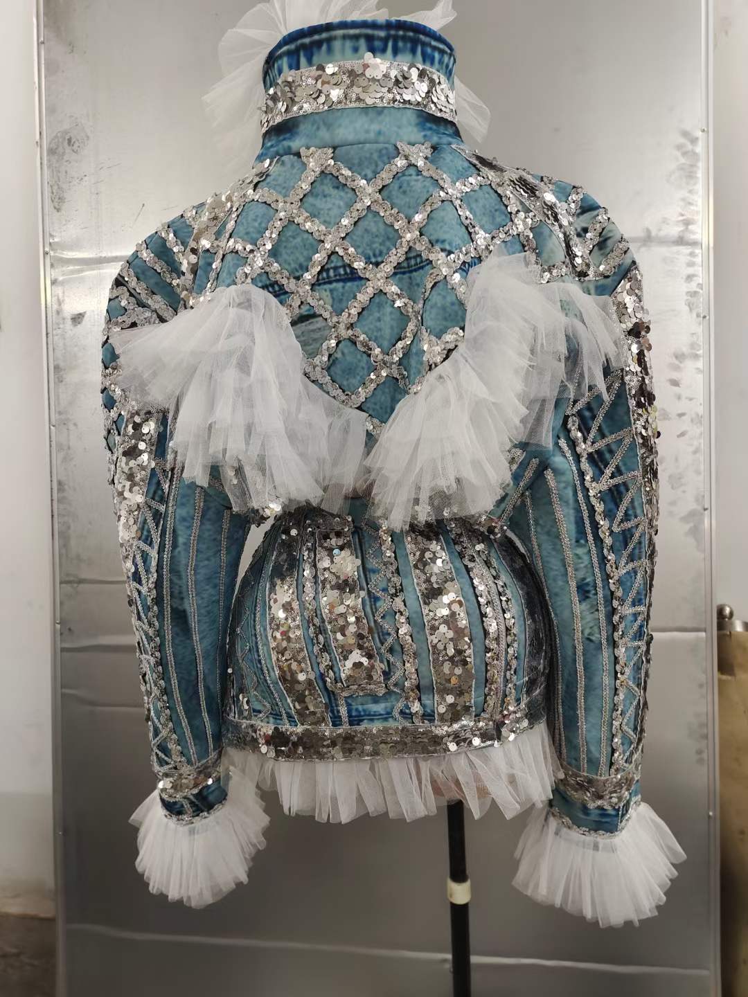 AD1128 Long Sleeve Lace Ruffled Sequined Jacket Crop Top With Skirt Denim 2 Piece Set Women'S Stage Outfit