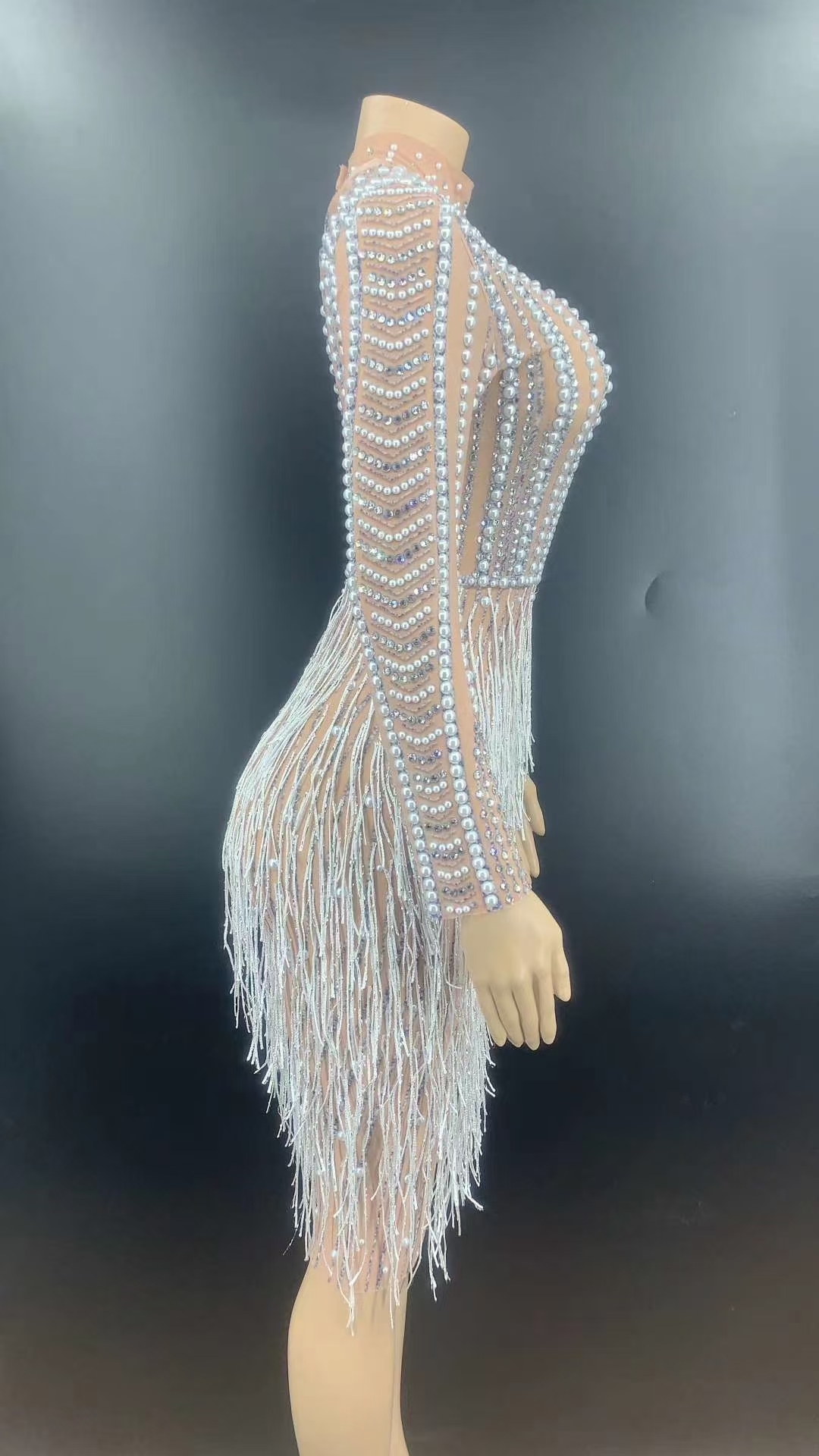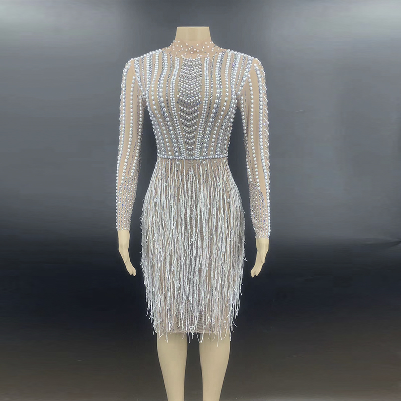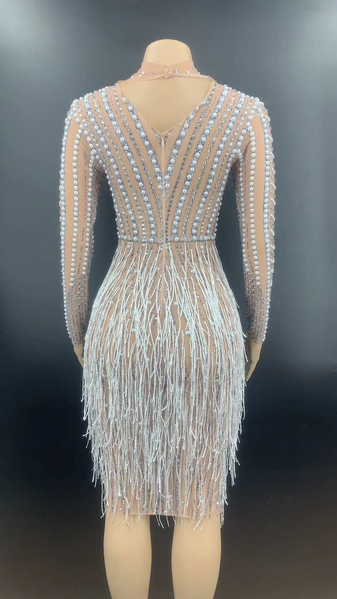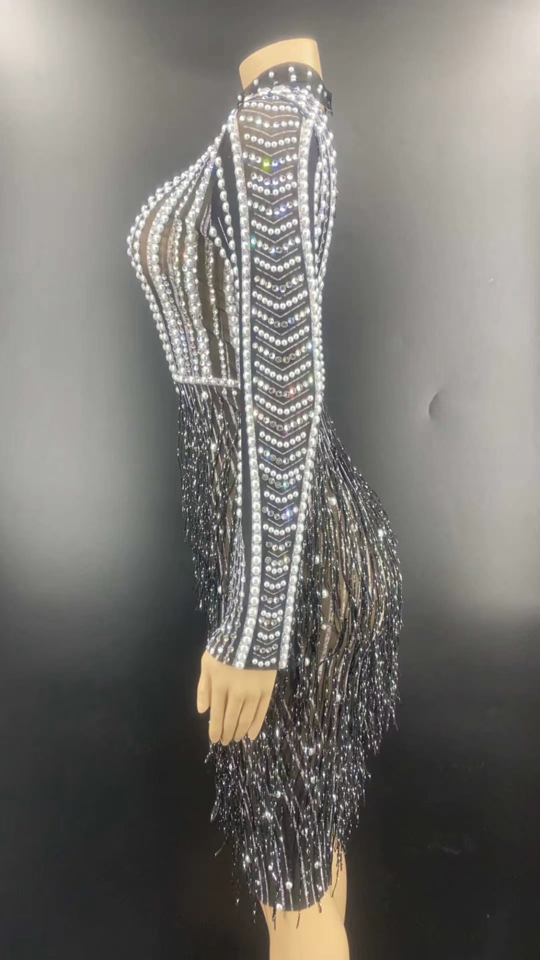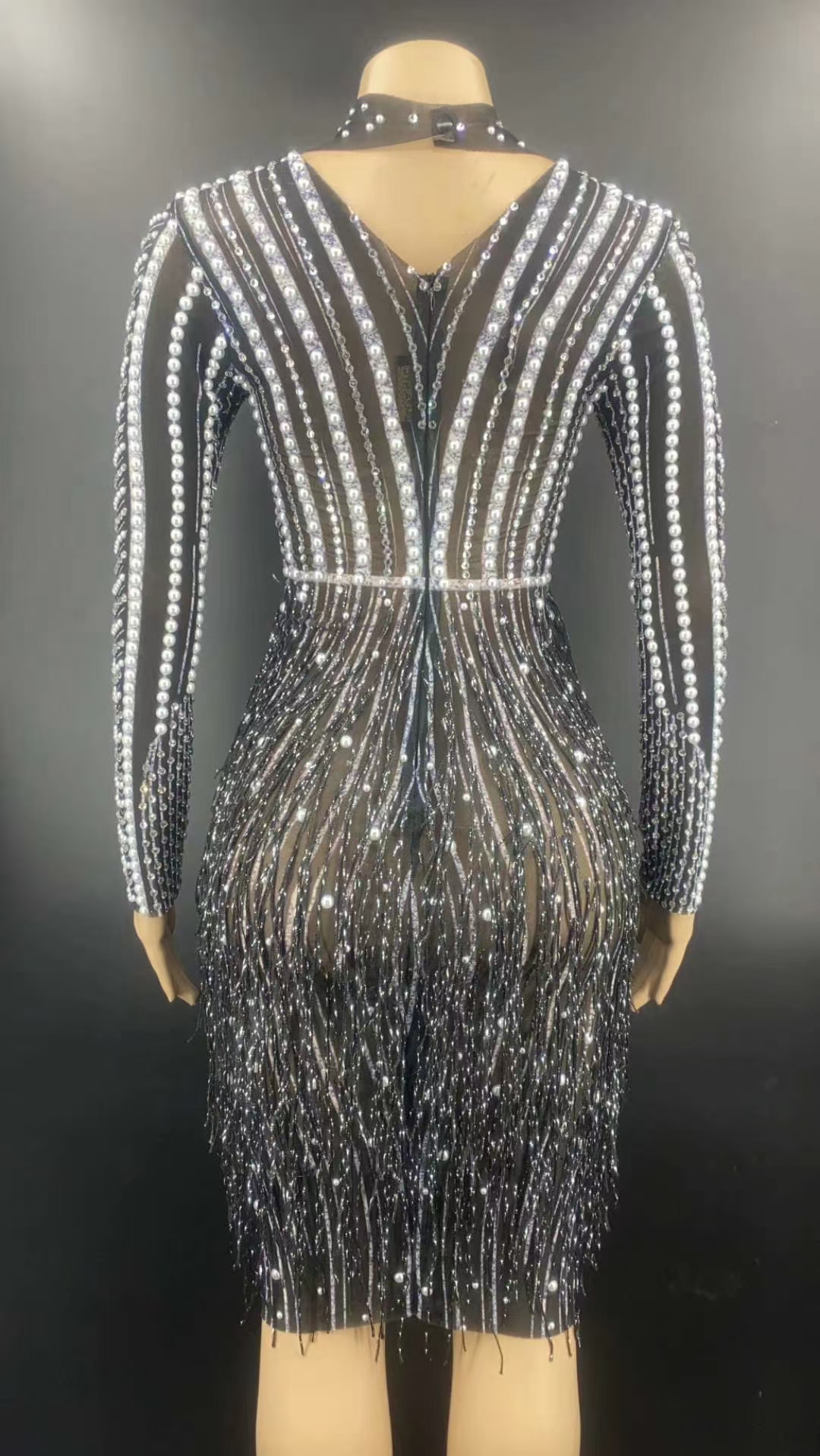AD1351 Kimshein Womens Elegant Black Tassel Dresses Beading Rhinestone Handmade Long Sleeve Hole Midi Evening Dress