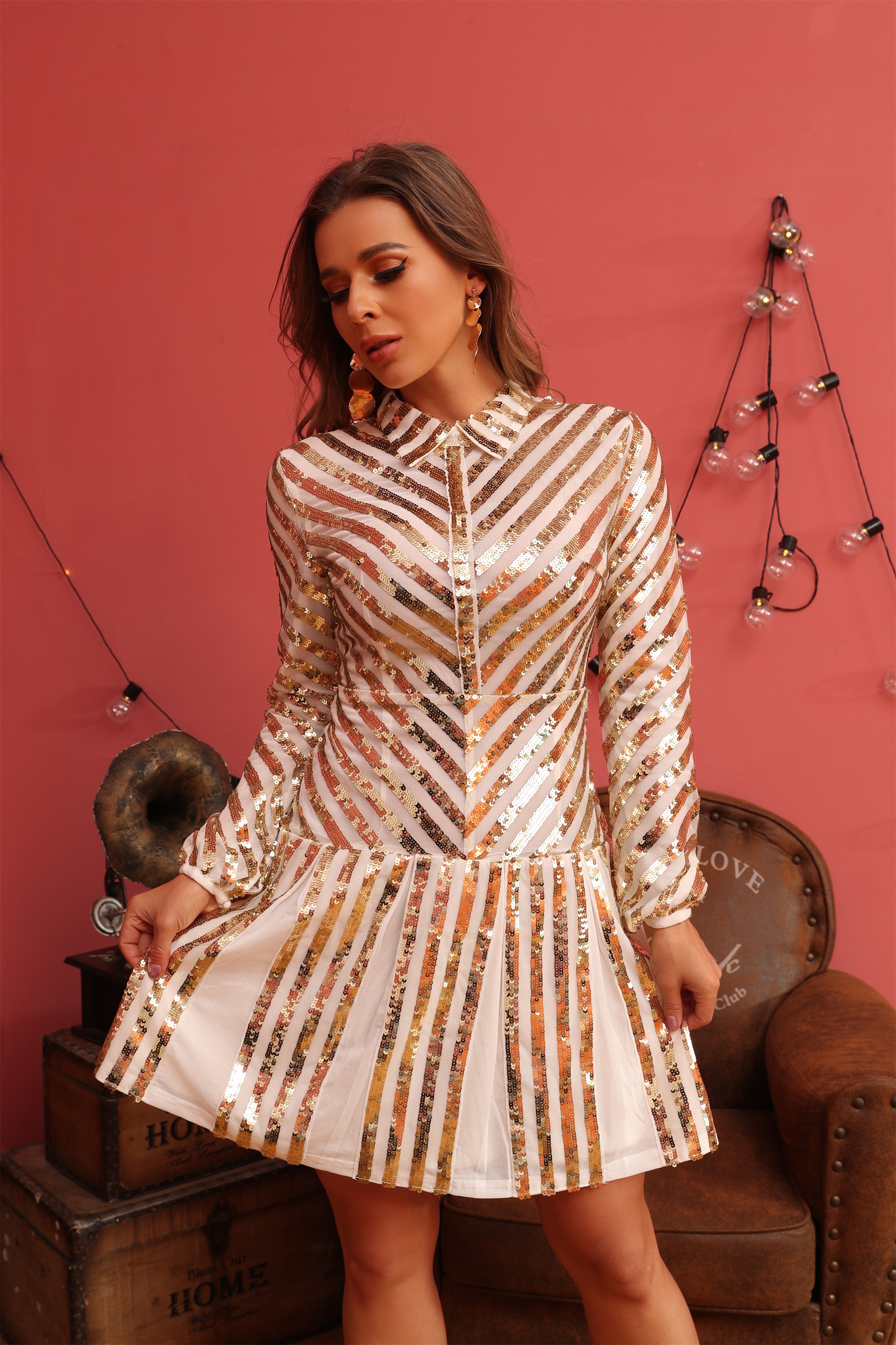 ED2198 Kimshein Ladies Elegant High End Turn Down Collar Long Sleeve Striped Sequin Gala Party Dresses