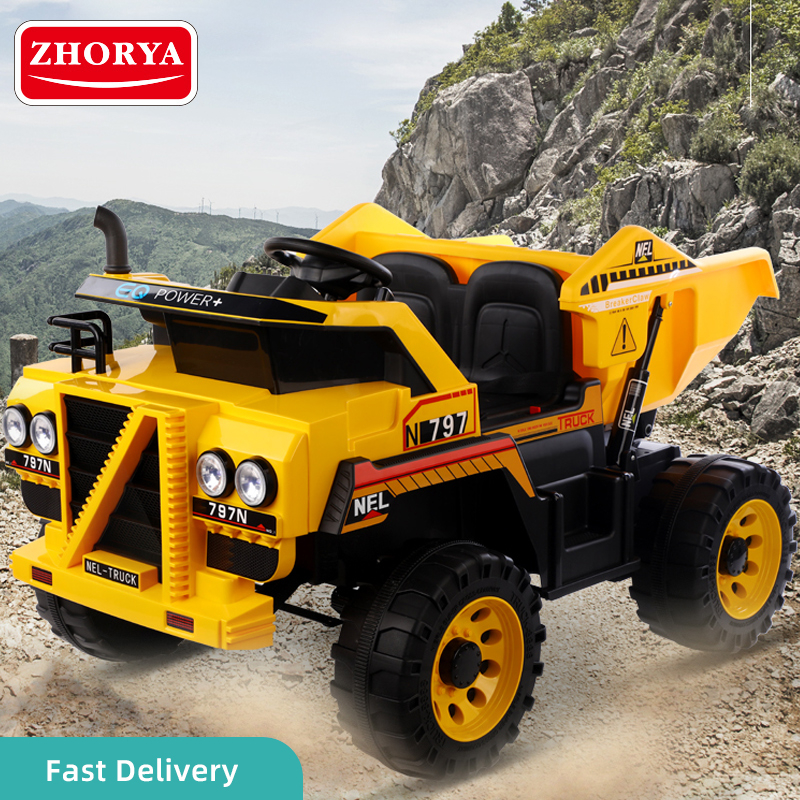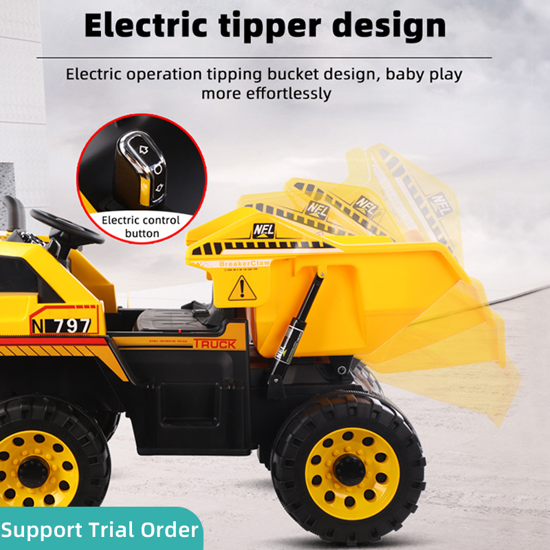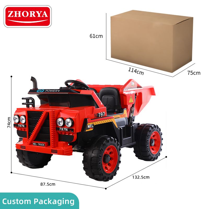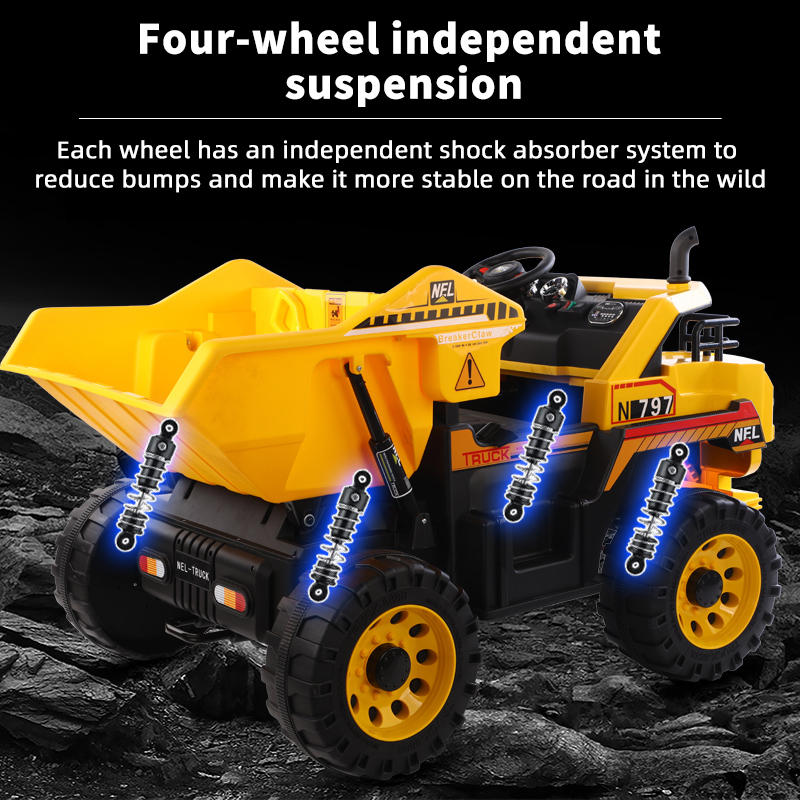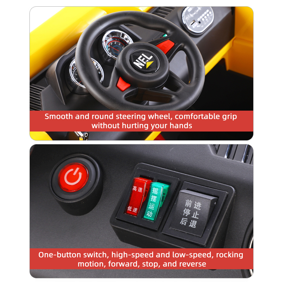 Features | Large battery (12V7A*1), four-drive 12V (390*4), one-key start, one-key quick installation of the steering wheel, USB interface,MP3 socket, high and low speed, dynamic music, LED lights, electric dumper, four-wheel shock absorber, Swing back and forth,mobile phone remote control, 2.4G Bluetooth remote control one to one! |