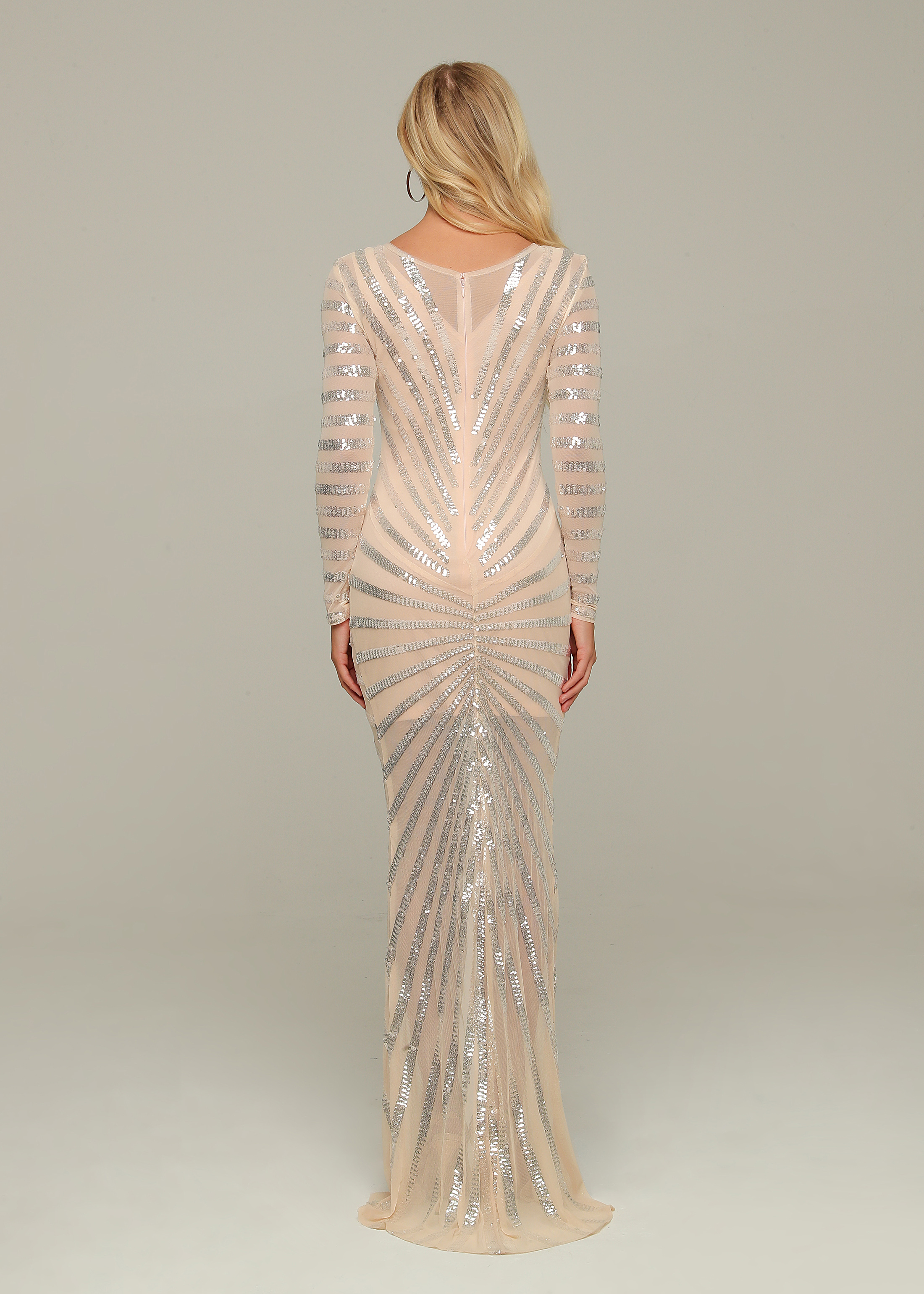 ED2210 Kimshein Clothes Women Elegant Beige Split Long Sleeve Mesh Dresses Sequin Stripe Prom Dress Evening