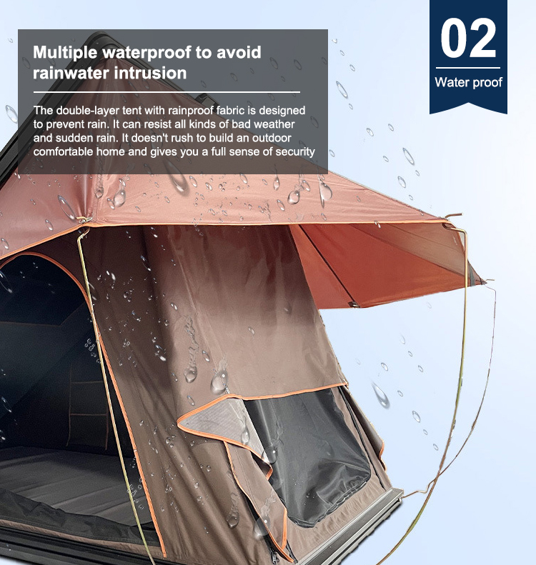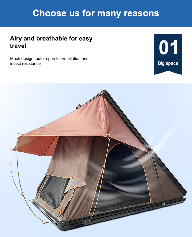 1.Easy to open and close, never worry about the quality. 2.Keep you away from the rain, wind, wet, cold and insects. 3.Make your self-driving tour more convenient. 4.Heavy duty ABS cover provides effective protection for the tent. 5.Large windows offer good ventilation and allow for greater airflow throughout the tent.6.Installation is simple, one person can complete.7.No noise when the vehicle is running.8.The product is low in price and can replace RV travel.
