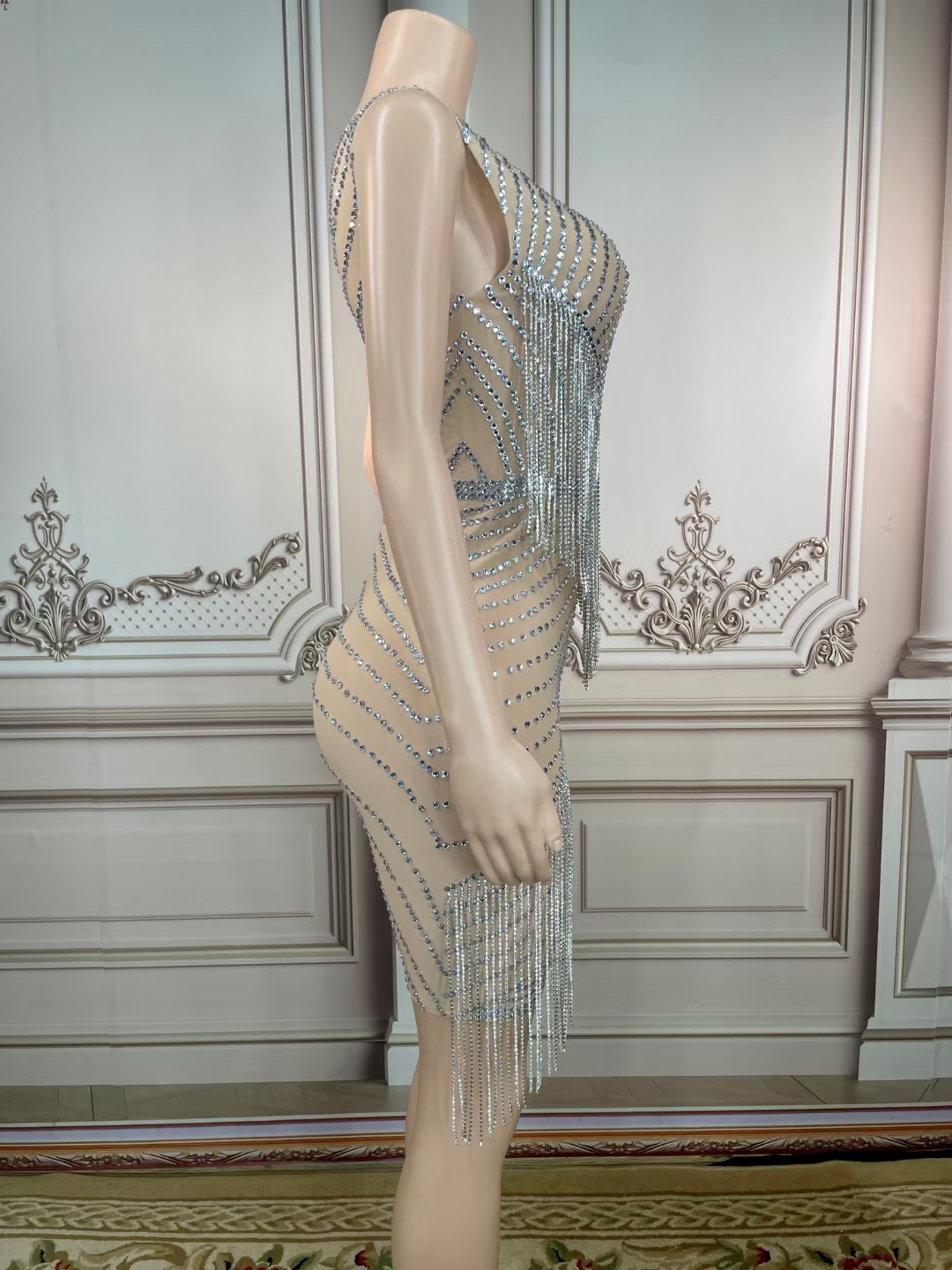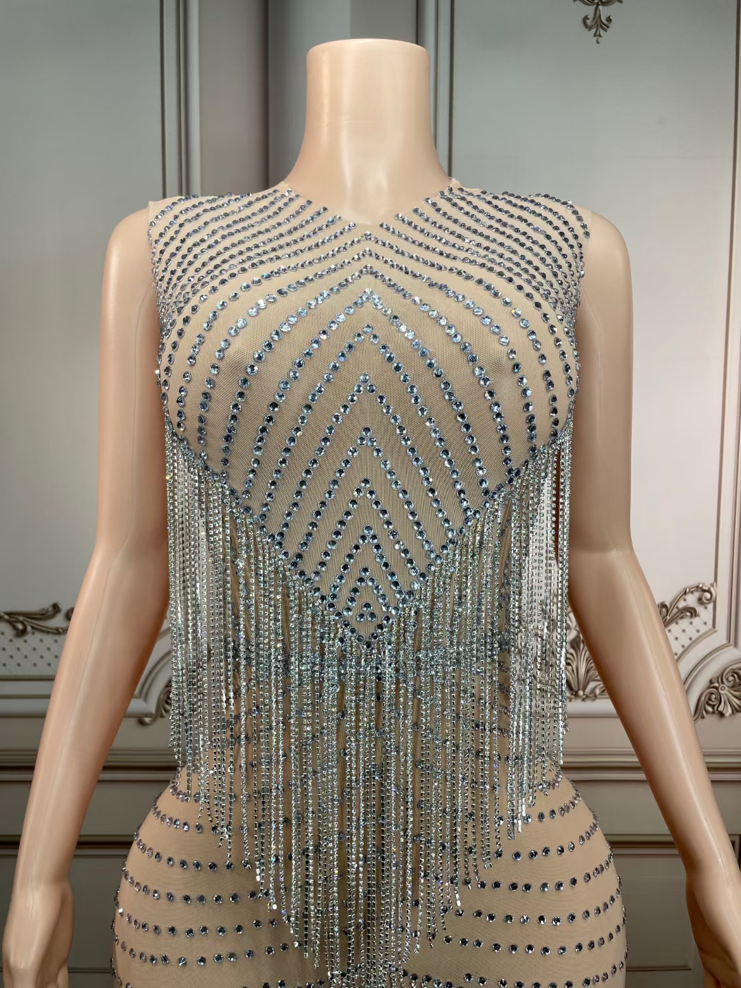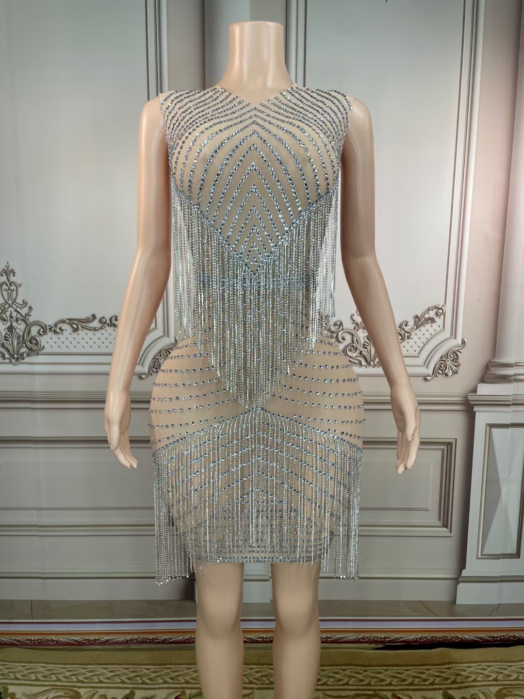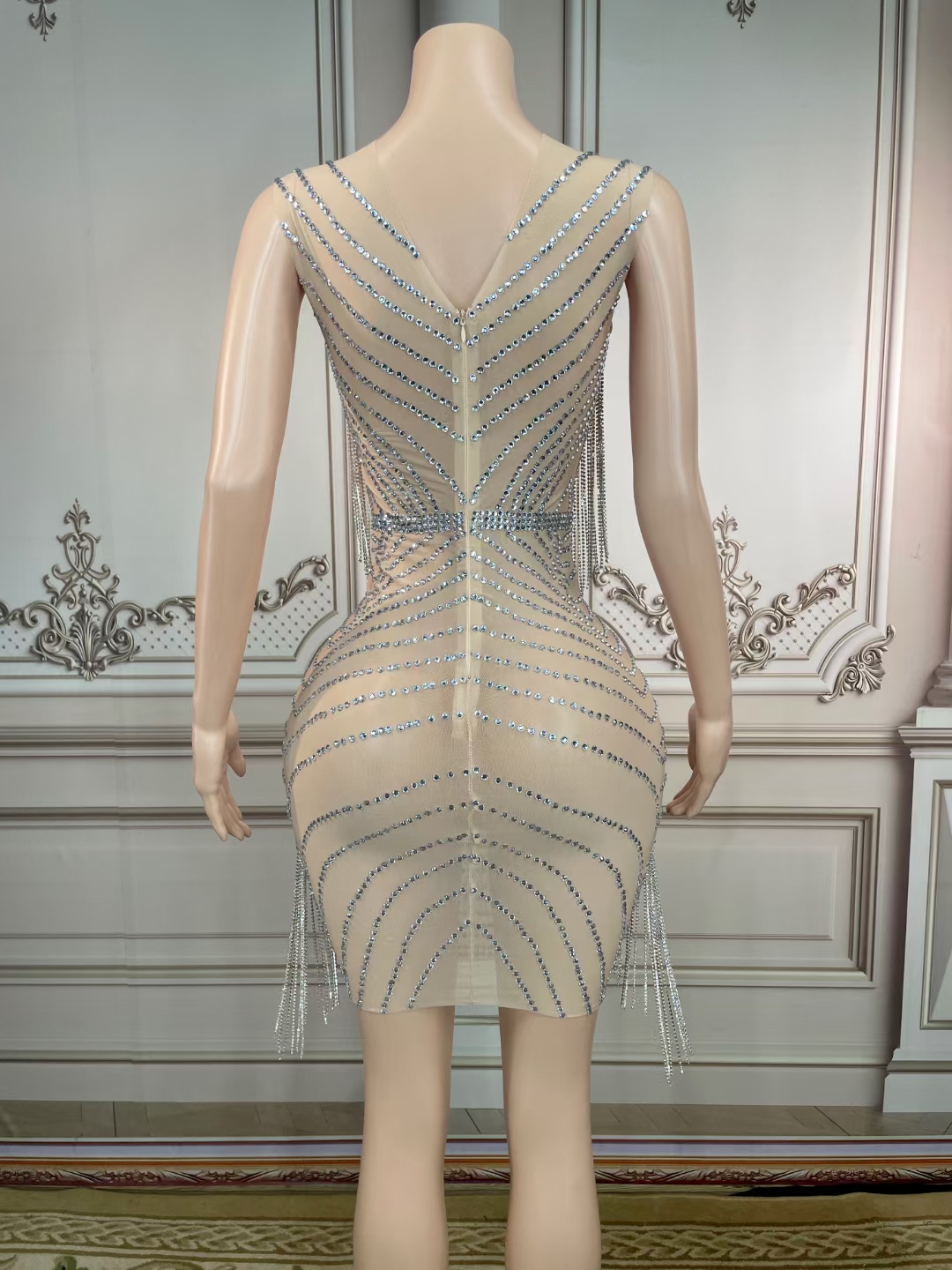 AD1470 Kimshein Clothing Women Elegant Dress Handmade Crystal Mesh Transparents Beaded Tassel Bodycon Dress Party Evening