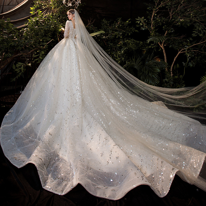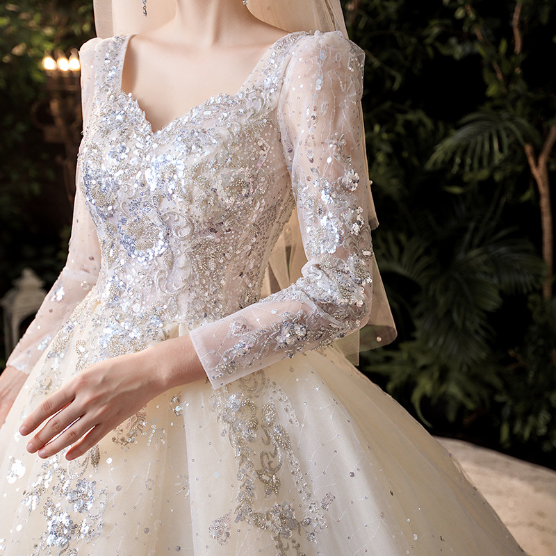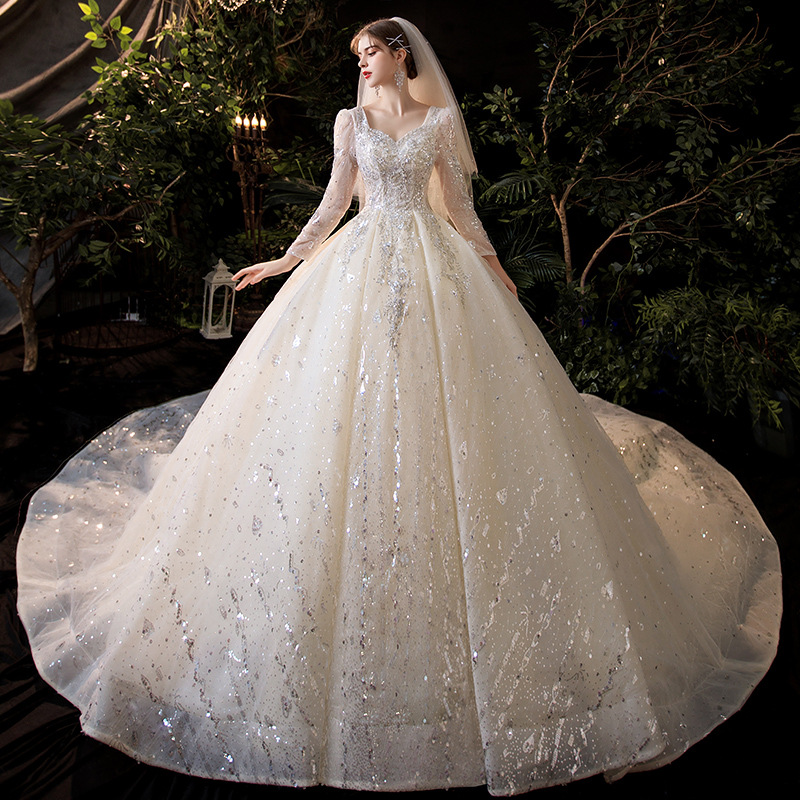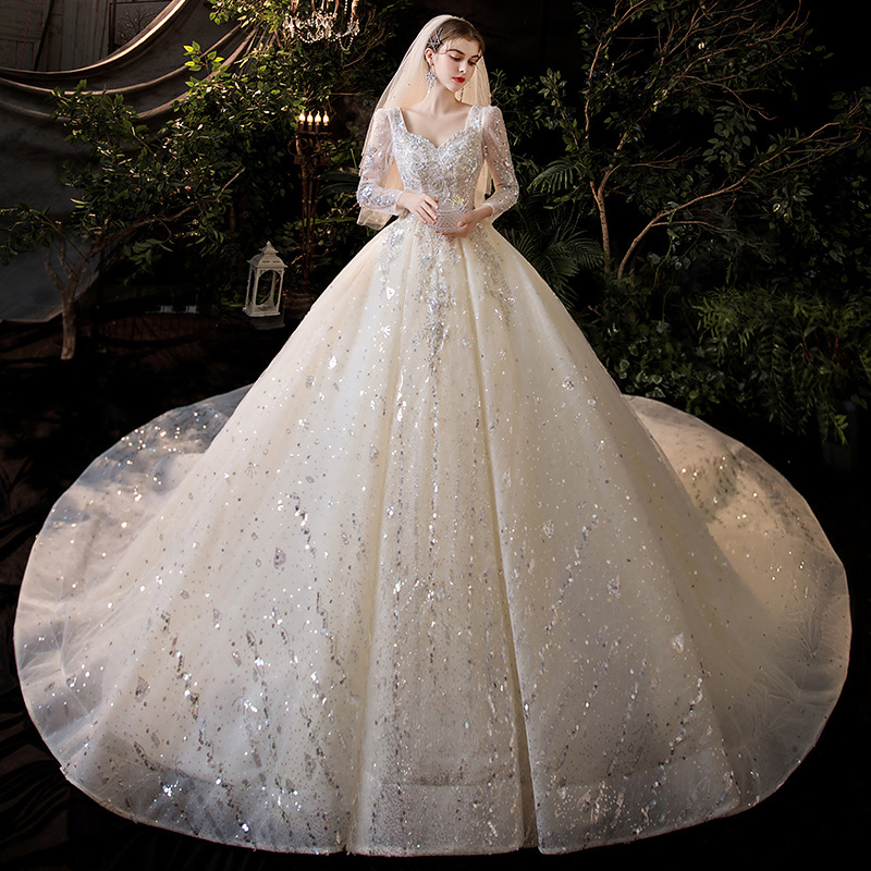 French main wedding dress 2020 new bride starry sky high-end luxury small pregnant woman temperament trailing long sleeves 2021