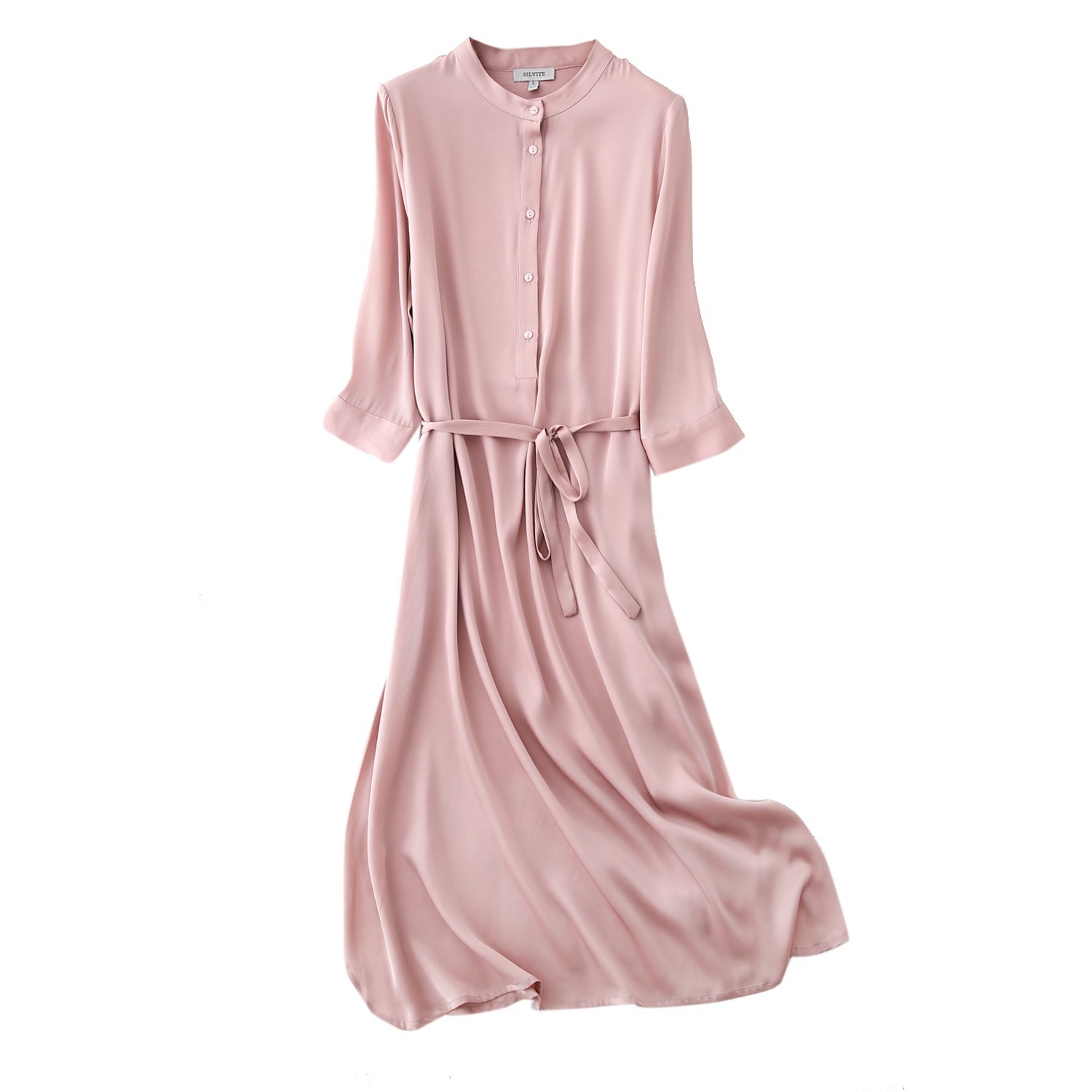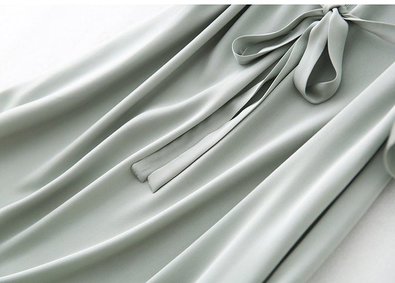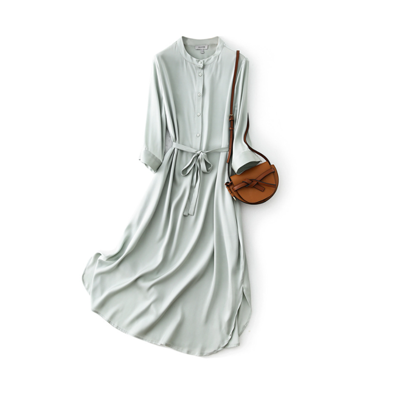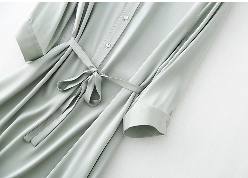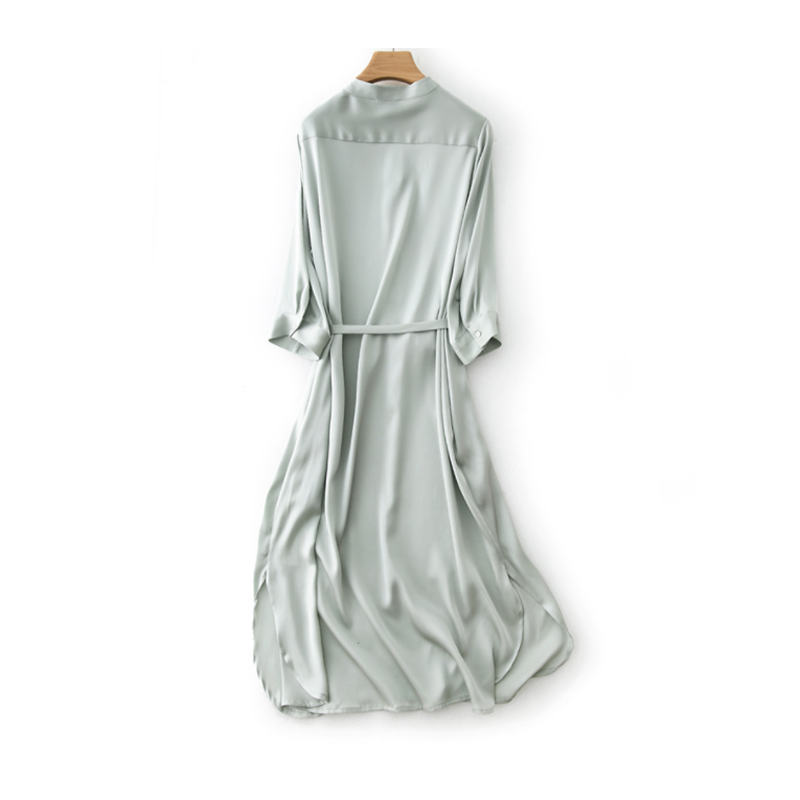 Summer satin silk dress women round neck pure color waist slim long temperament shirt skirt