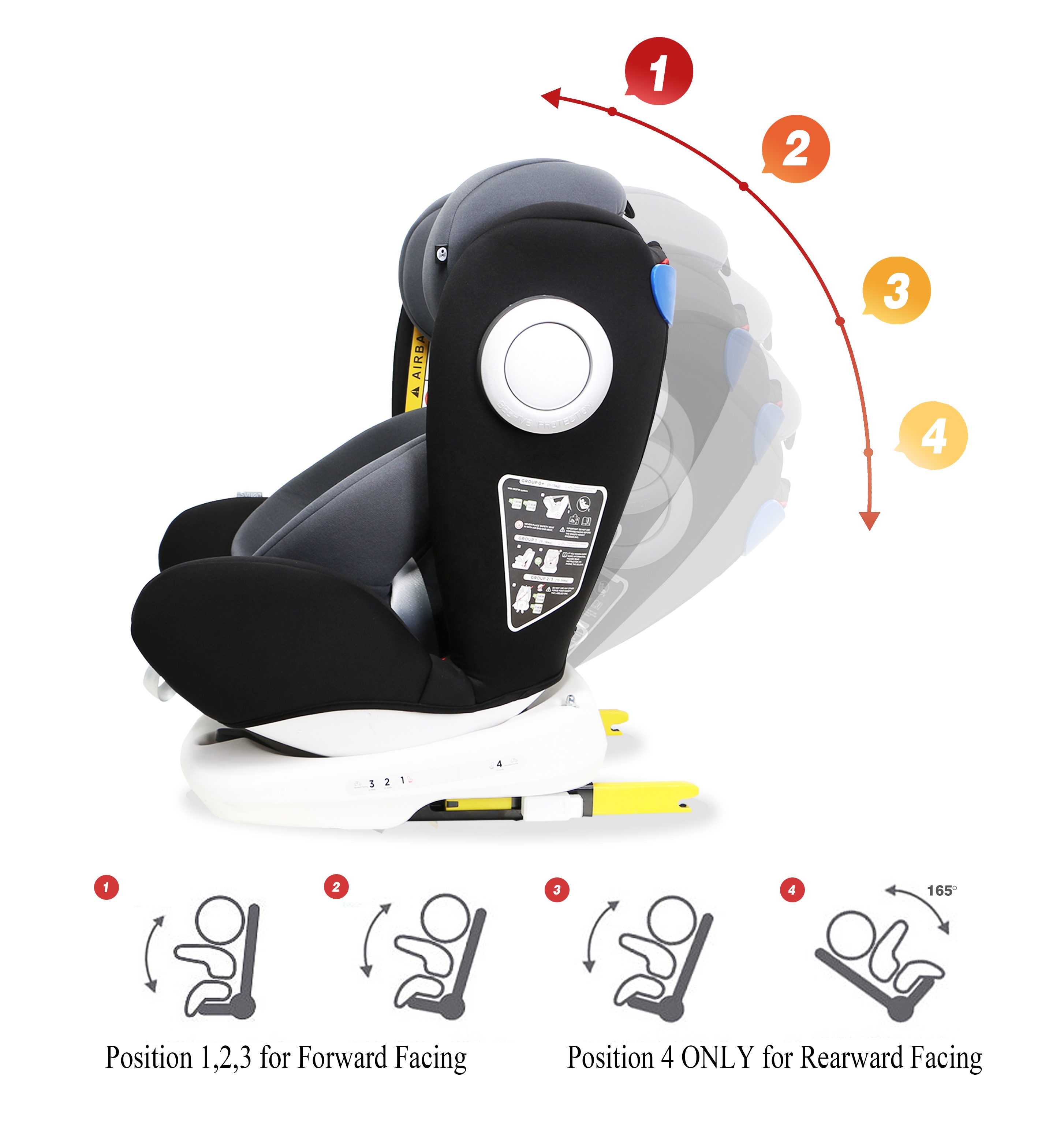 * Rear facing install, 0~13kg (0~15 M) Group 0+* Forward facing install,9~36kg (9M~12Y) Group 1,2,3* Blow moulding* Equipped with 5-point safety belt system.* Headrest with 7 level adjustment* Backrest with 4 level reclining position system,* 3 positions of belt adjustment to children's height.* ECE & CCC * SIPS with plastic cover