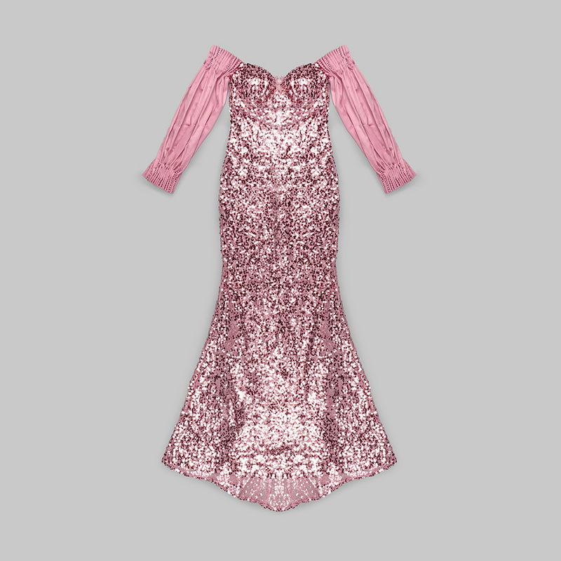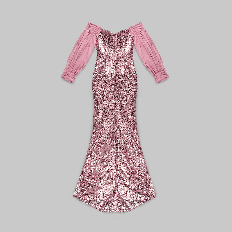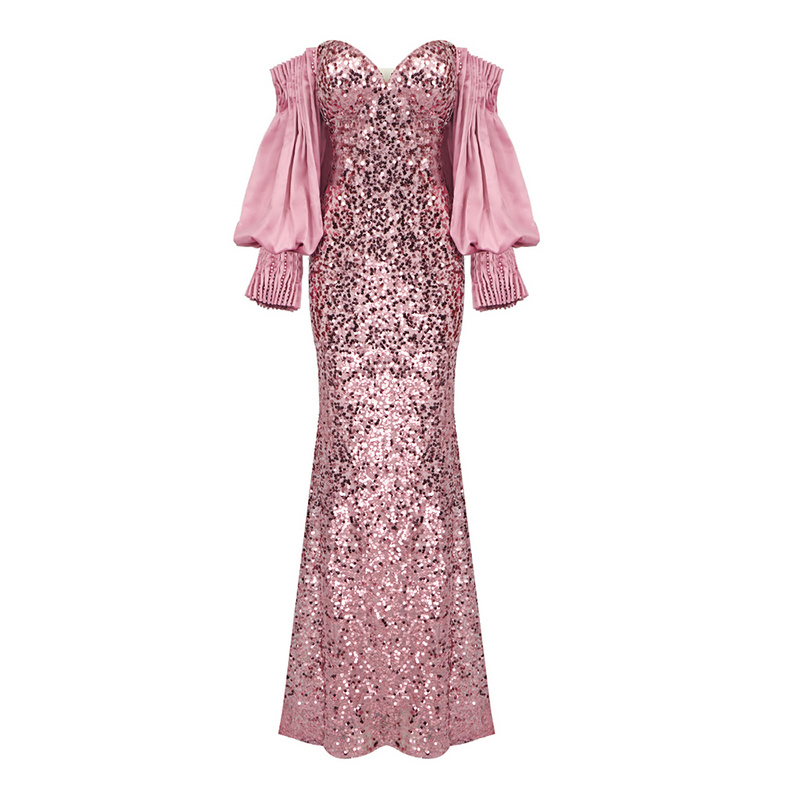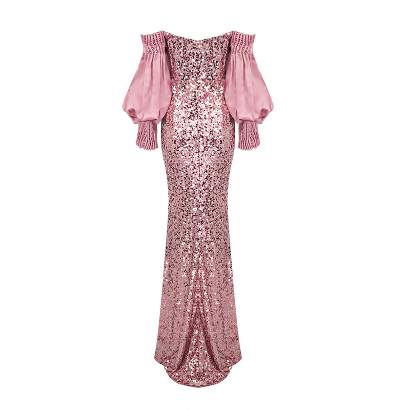 A7440 High Quality Evening Women Dress Purple Sequin Trailing Bodycon Bubble Sleeve