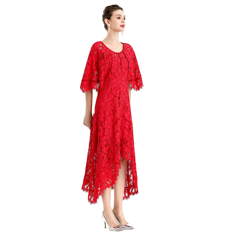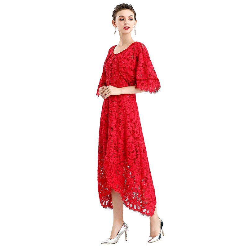 O-neck sexy,Eyelash scallop of ruffle hem/sleeve opening, Neck/ armhole/ sleeve opening sewn lace bringing most lightsopt,High low irregular hem,CF split by botton closing on bodice, Waist seam for slim waist, CF/CB seam,Ball gown flare skirt covering belly and bringing gliding feel. Loose fit flare long dress.