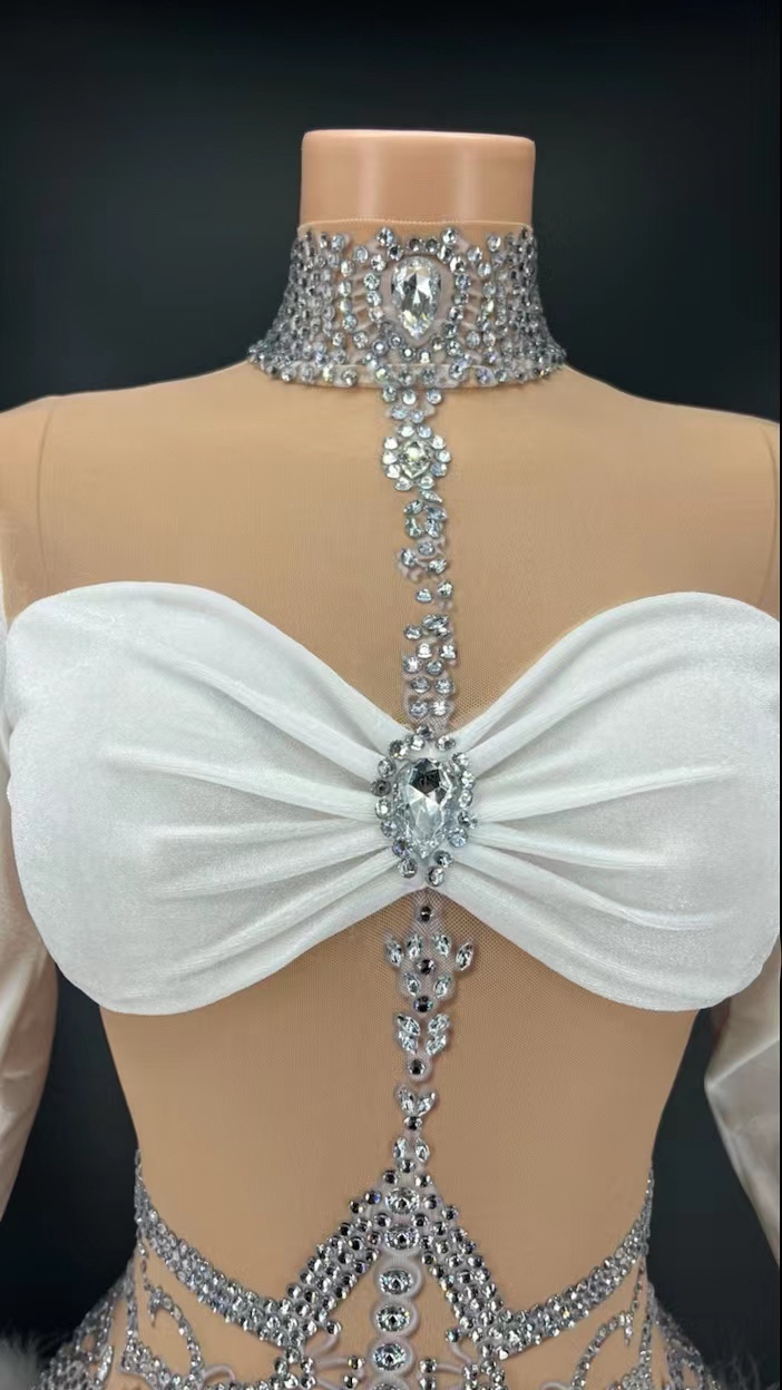 Diamond Dress Beaded Mesh SatinWomen Luxury Ivory Elegant Dress Party Feather Gown Dress