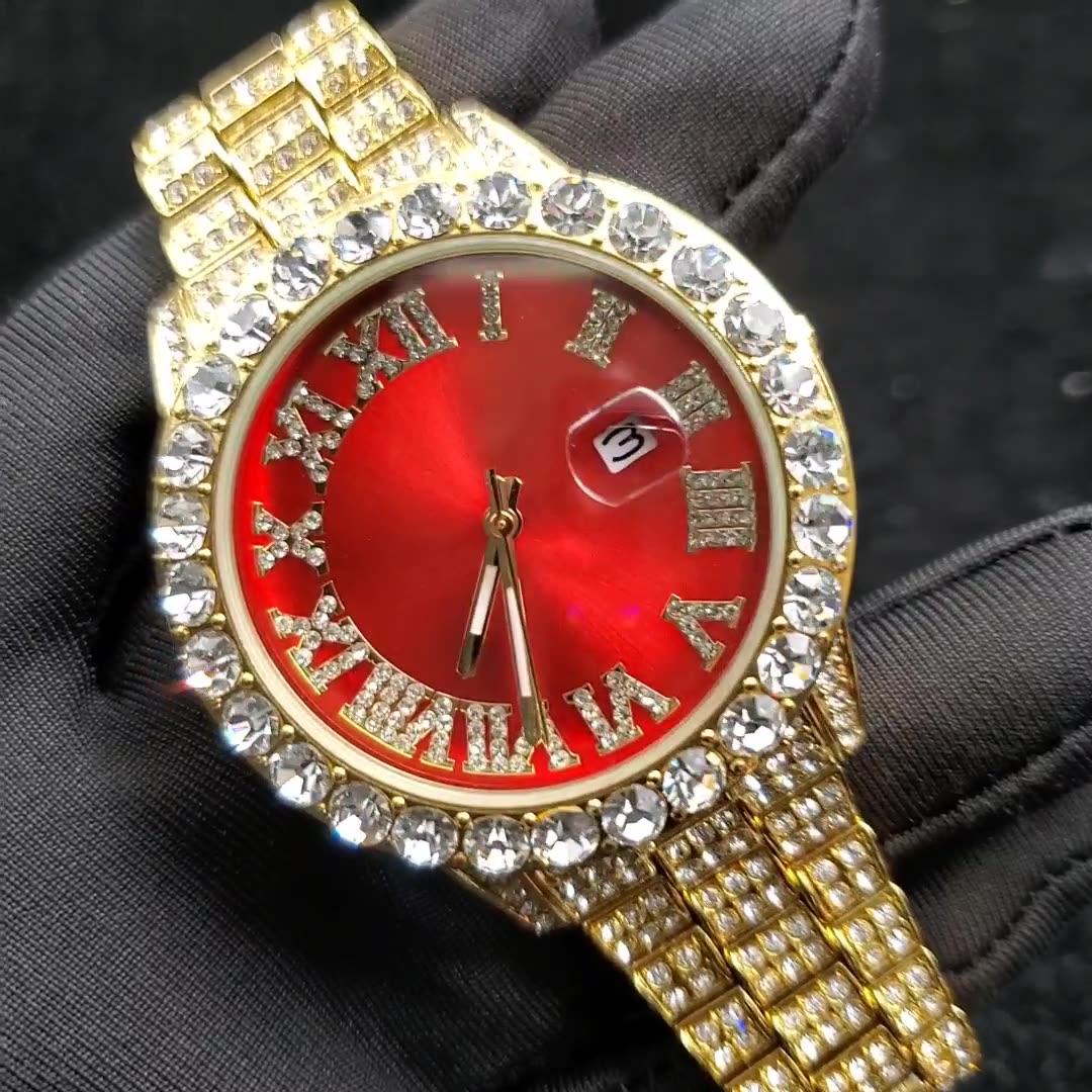 2020 Modern Diamond Waterproof Red bule green Dial Roman Numerals Top Brand Luxury 18k Gold Quartz Watch Men