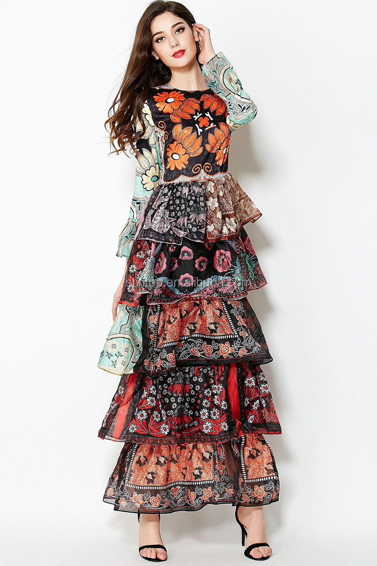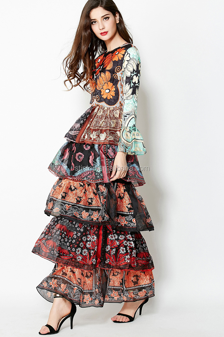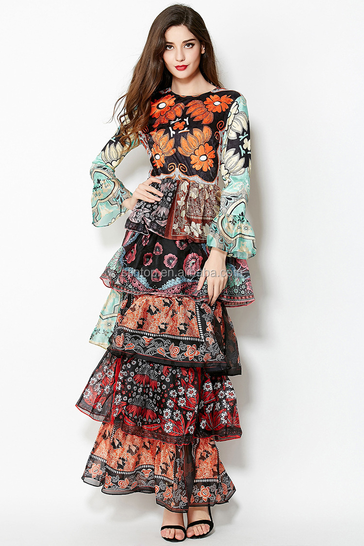 H001 New fashion Beautiful Women silk dress Layered Horn Sleeve Print Slim Catwalk Dress