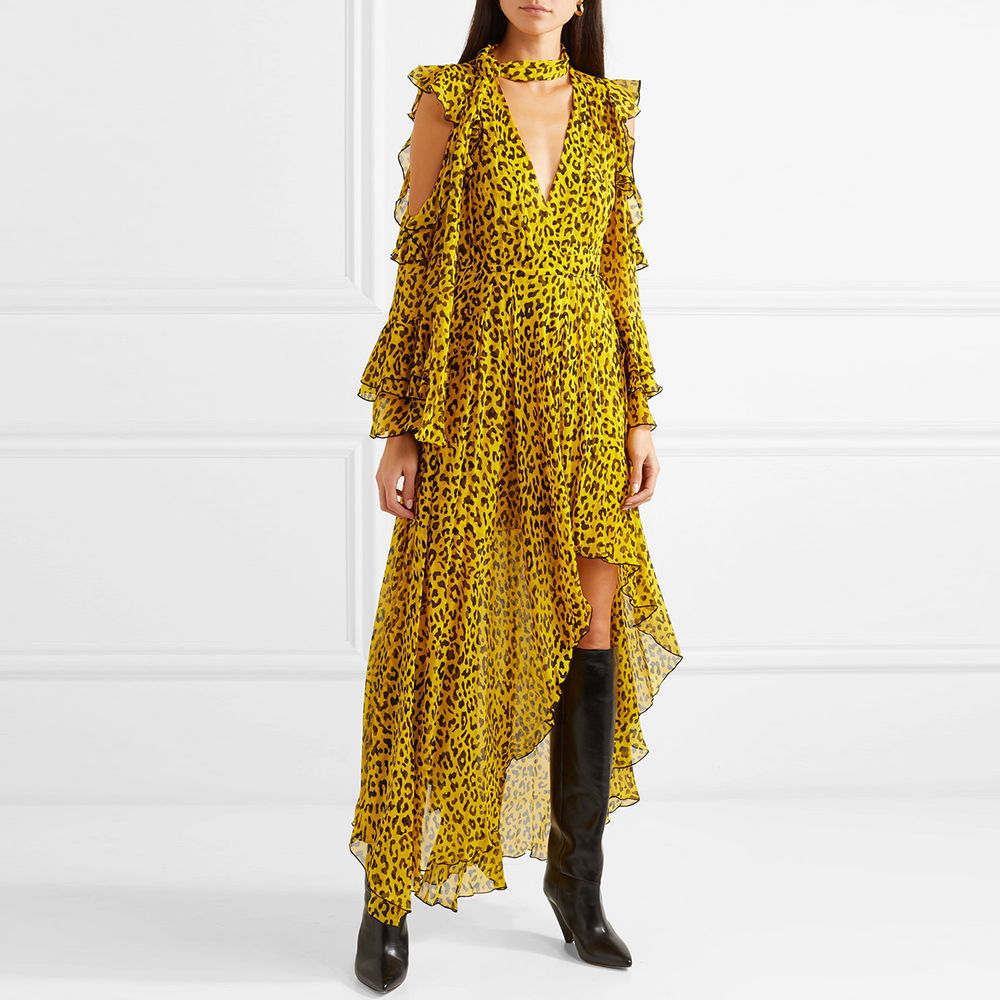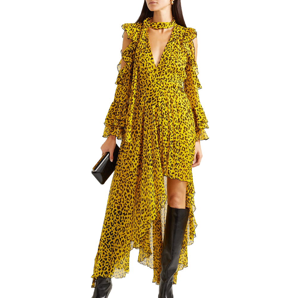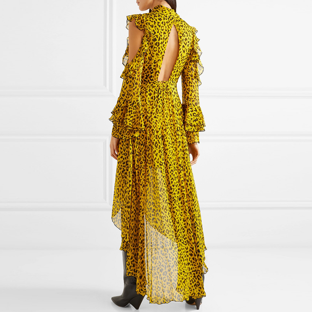 | Product Name | Ruffled Yellow Leopard Print Long sleeves asymmetric Wrap Silk Maxi Dress sexy women spring dresses |