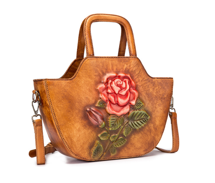 Retro new leather handbags hand-brushed carved diagonal cross-bag flower shoulder top layer leather handbag