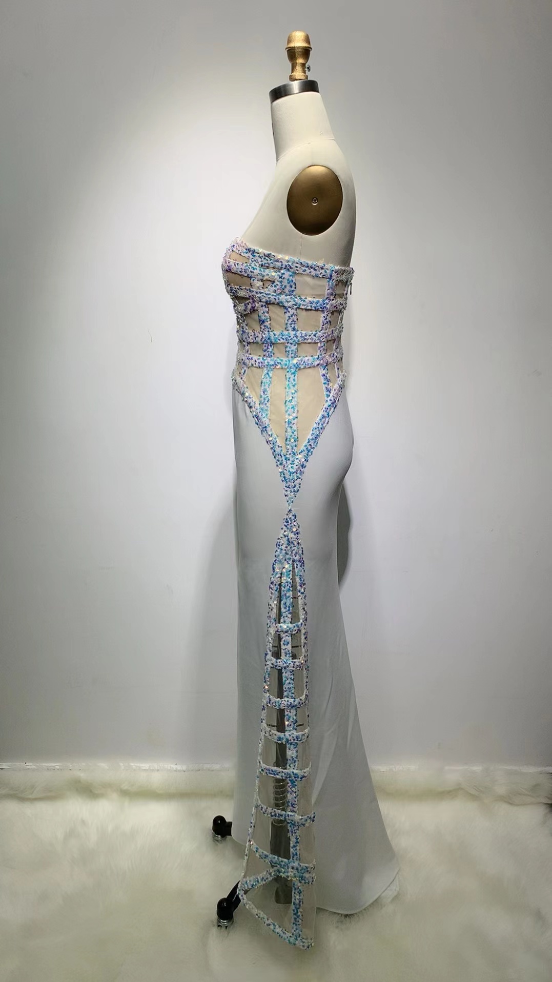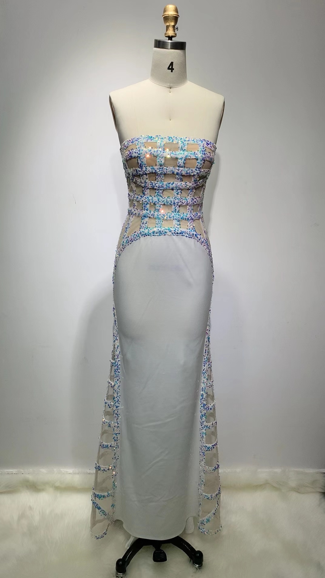 Fashion Beading Women Celebrity Nightclub Evening Long Bandage Bodycon Evening Dress