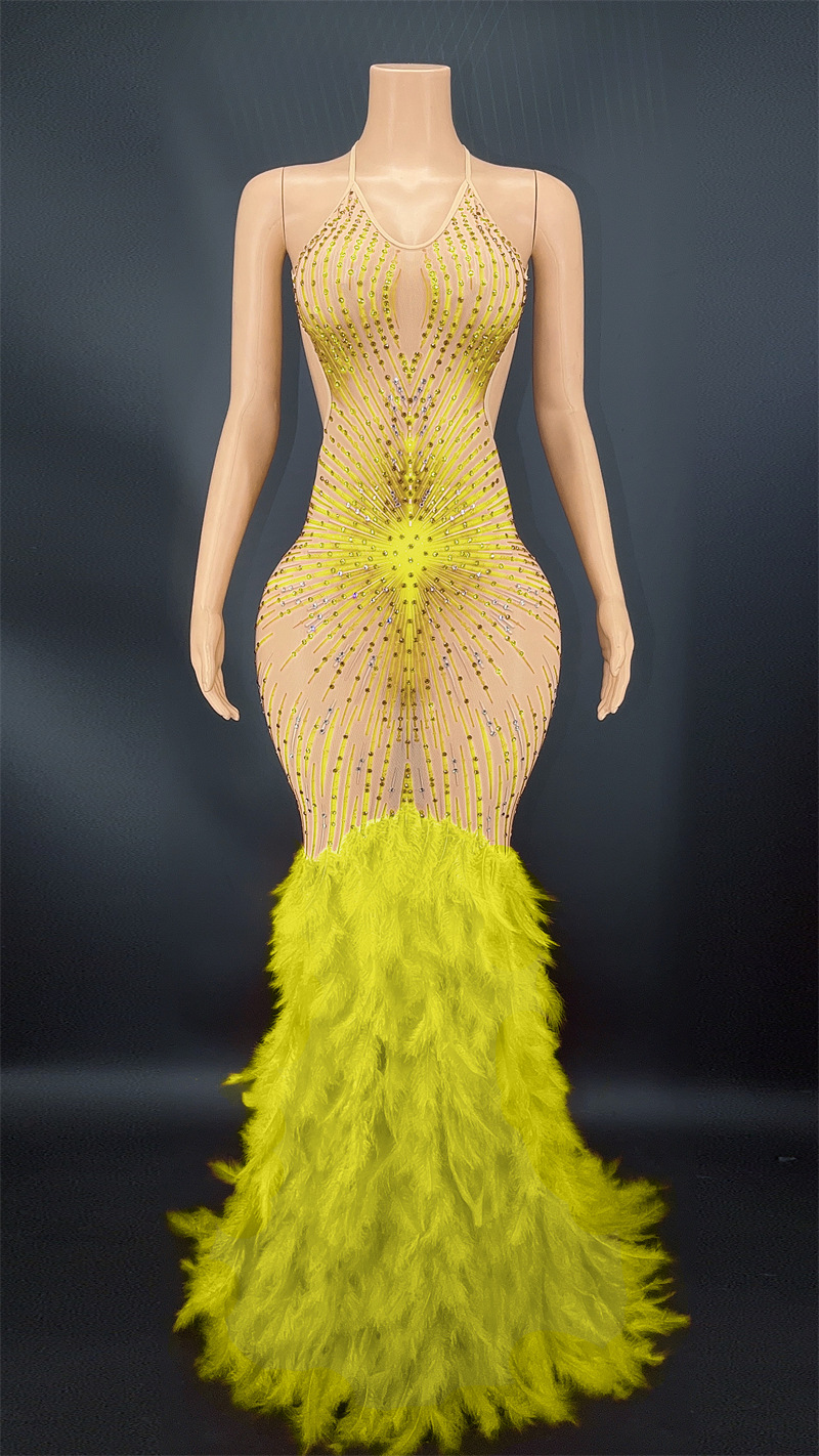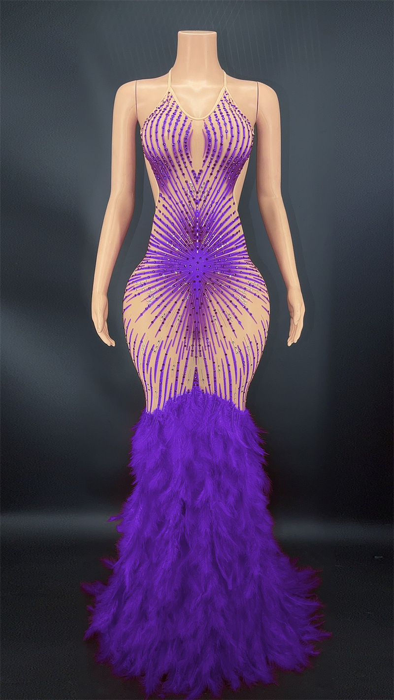 | Women Sexy Backless Long Pink Feather Shiny Rhinestone Pearl Dress | |