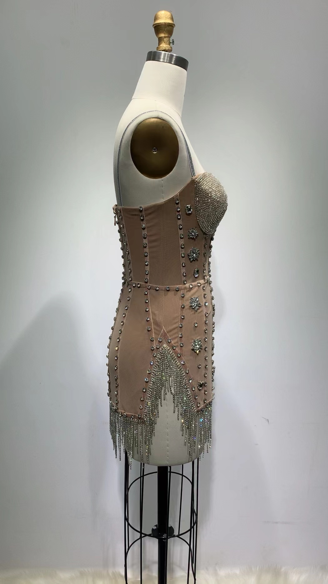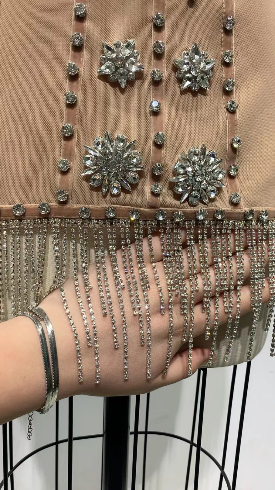 Top Quality Celebrity Shining Tassel V-neck Sequins Beading Runway MINI Evening Party Dress