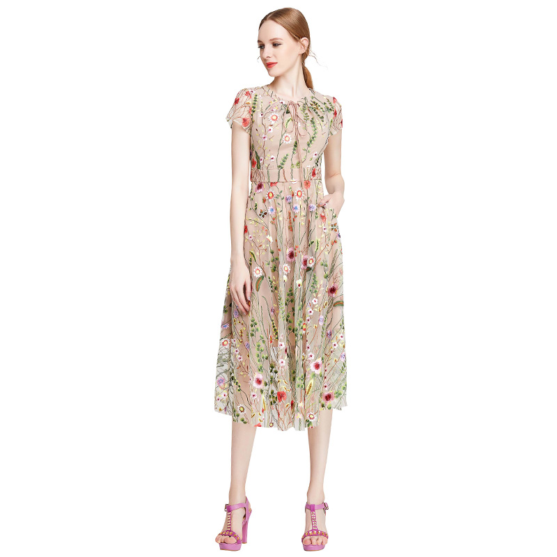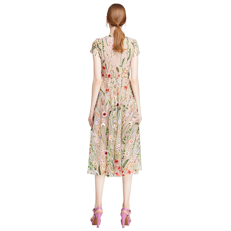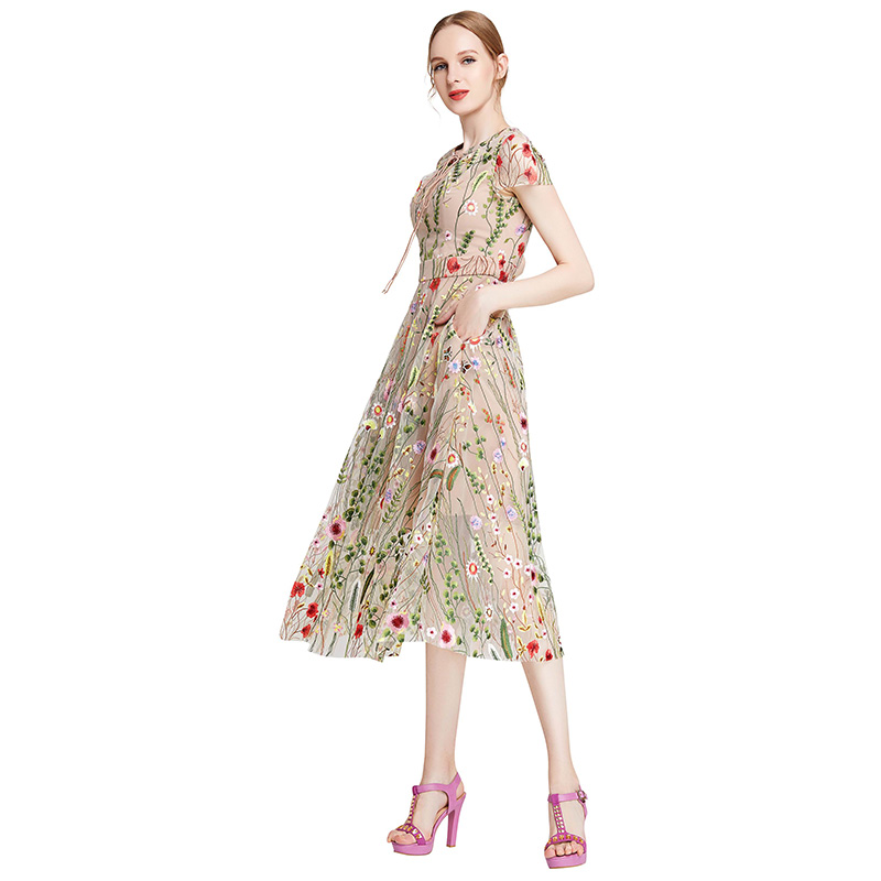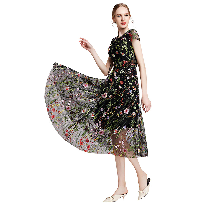 ND009 ODM OEM Women All-over floral embroidered tulle cap sleeves midi party dress