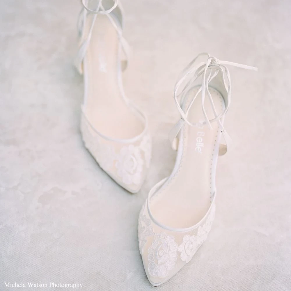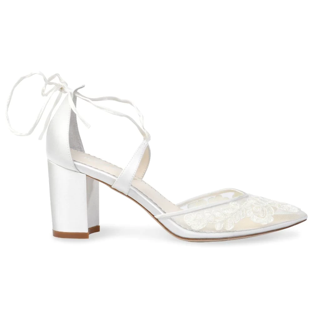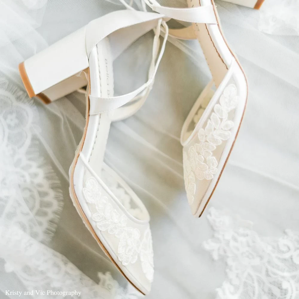 This ivory block heel features a hand-sewn illusion mesh upper graced with delicate Alencon lace flowers. The cross ankle straps and tied bow at the heel cups provide a secure finish and bring romance to these ivory block heels. Bella Belle's signature padding provides comfort.