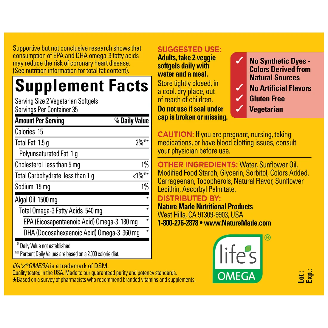 Looking to add a vegetarian Omega-3 supplement to your daily routine? Nature Made® Algae Omega-3 Softgels provide algal oil, a plant-based alternative to fish oil. Go one step down the food chain: fish originally get their Omega-3 fatty acids through consumption of algae! Two daily softgels provide 1500 mg of algal oil (540 mg Omega-3s). Supportive but not conclusive research shows that consumption of EPA and DHA Omega-3 fatty acids may reduce the risk of coronary heart disease. (See nutrition information for total fat content).†