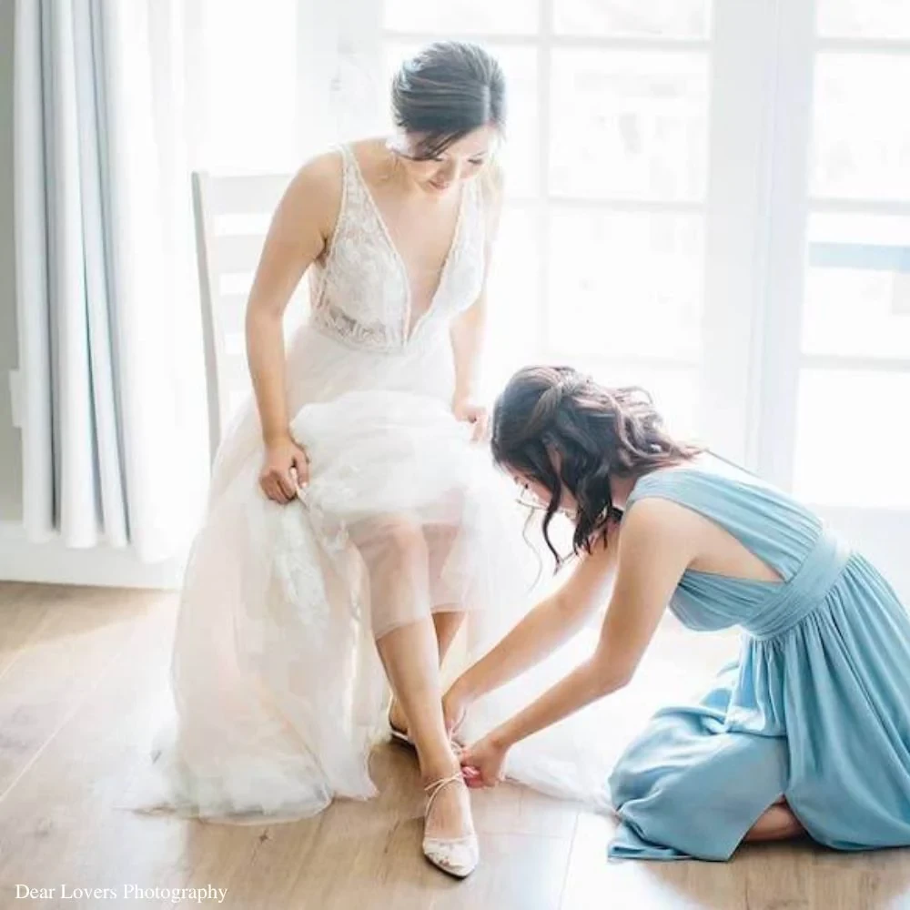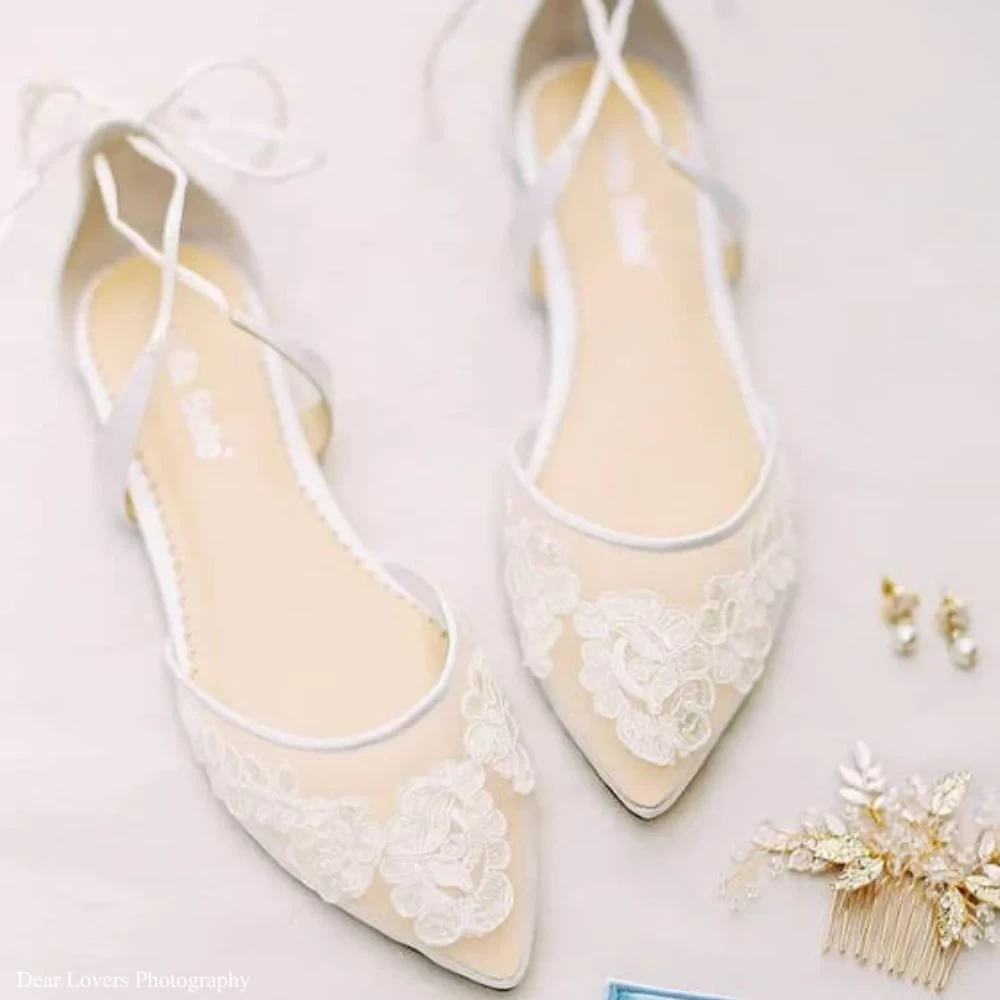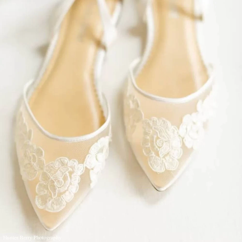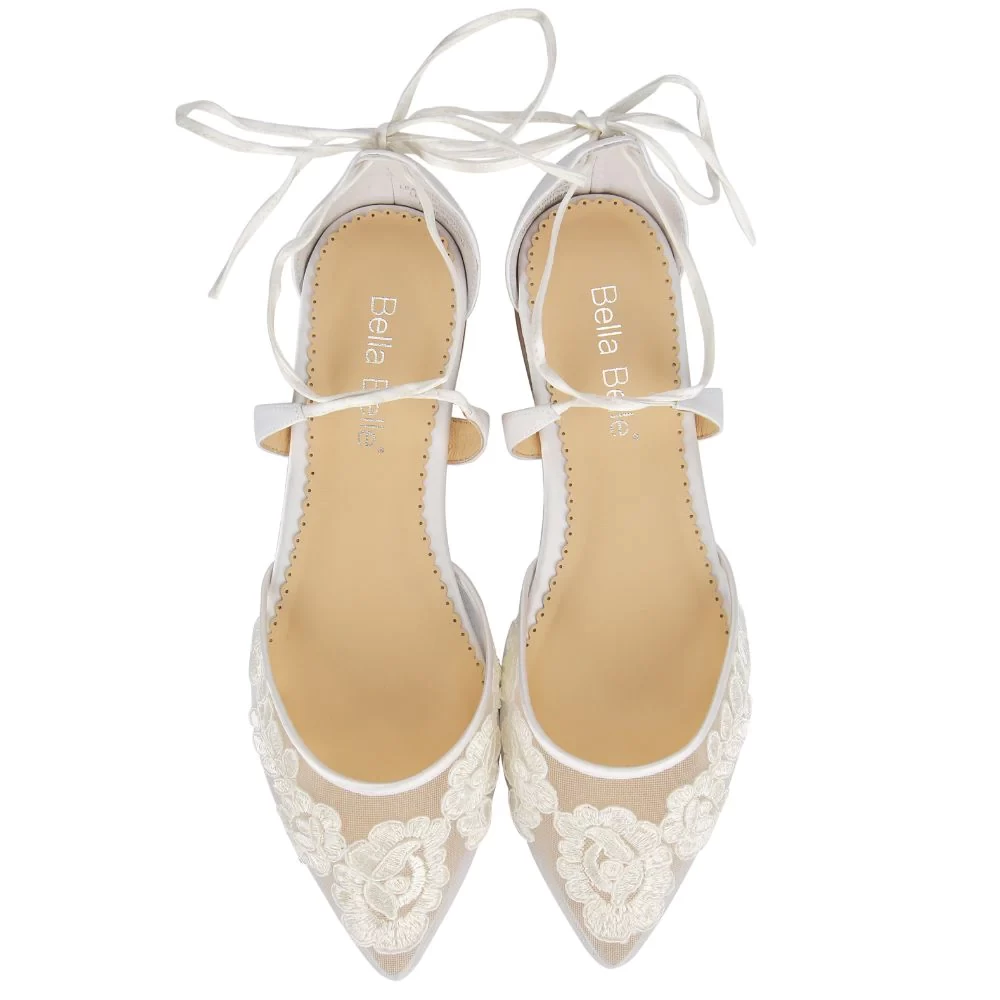 Alicia classic and chic bridal ballet flats with straps feature a hand-sewn illusion mesh upper graced with delicate Alencon lace. The cross ankle straps and lovely tied bows at the heel provide a secure finish and add a feminine touch to these romantic wedding ballet flats. Heavy padding on these cross strap ballet flats ensures all-day comfort.