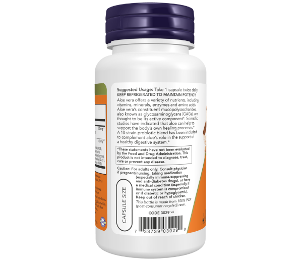 Aloe vera offers a variety of nutrients, including vitamins, minerals, enzymes and amino acids. Aloe vera’s constituent mucopolysaccharides, also known as glycosaminoglycans (GAGs), are thought to be its active component*. Scientific studies have indicated that aloe can help to support the body’s own healing processes.* A 10-strain probiotic blend has been included to complement aloe’s role in the support of a healthy digestive system.*