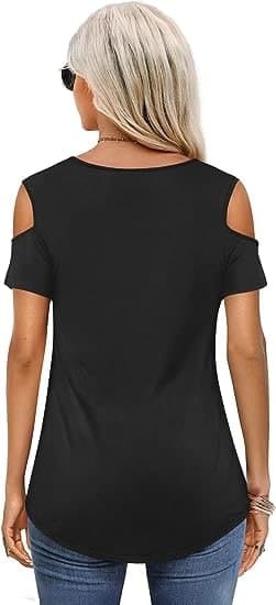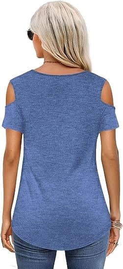 Casual cold shoulder tops, v neck curved hem, short sleeve tshirts.