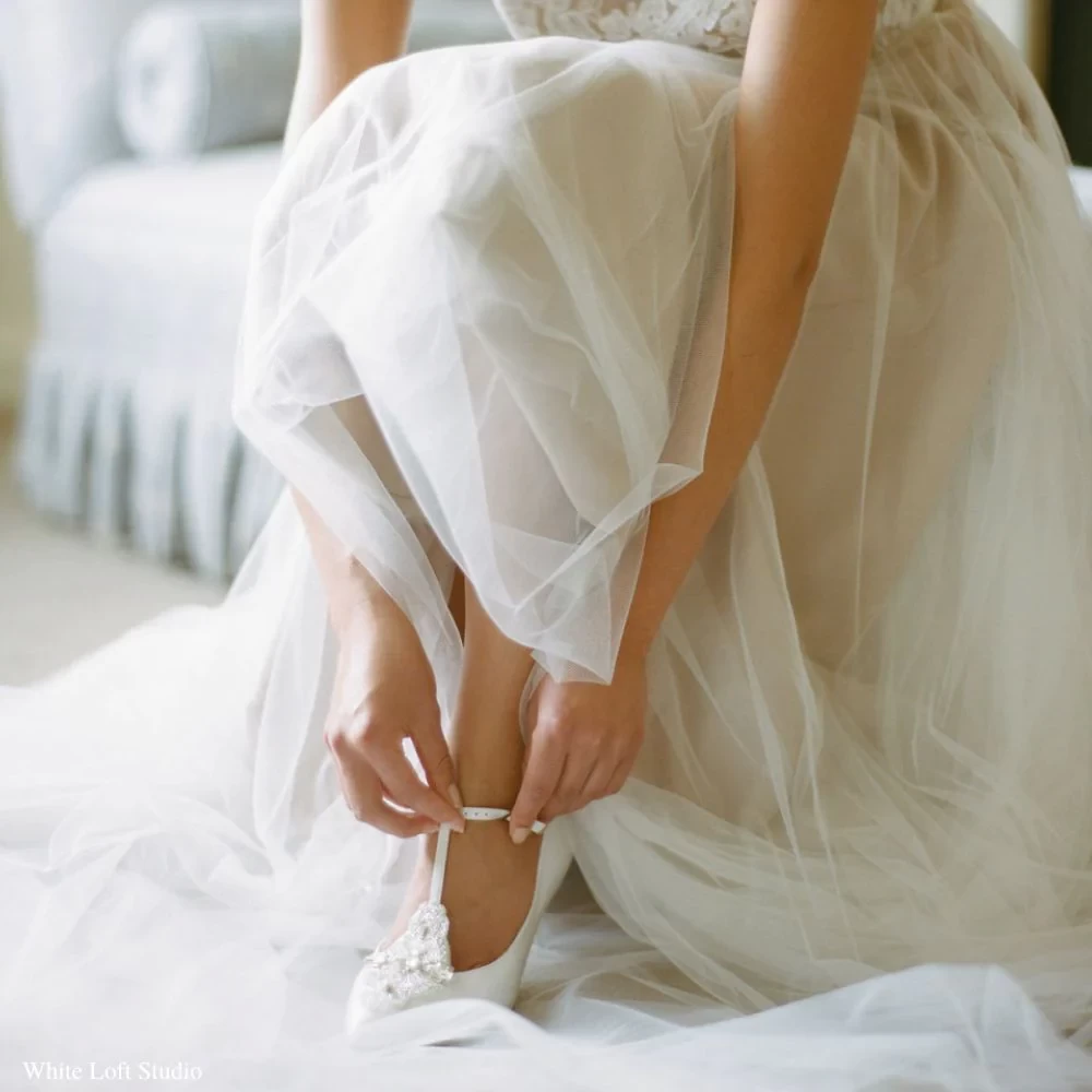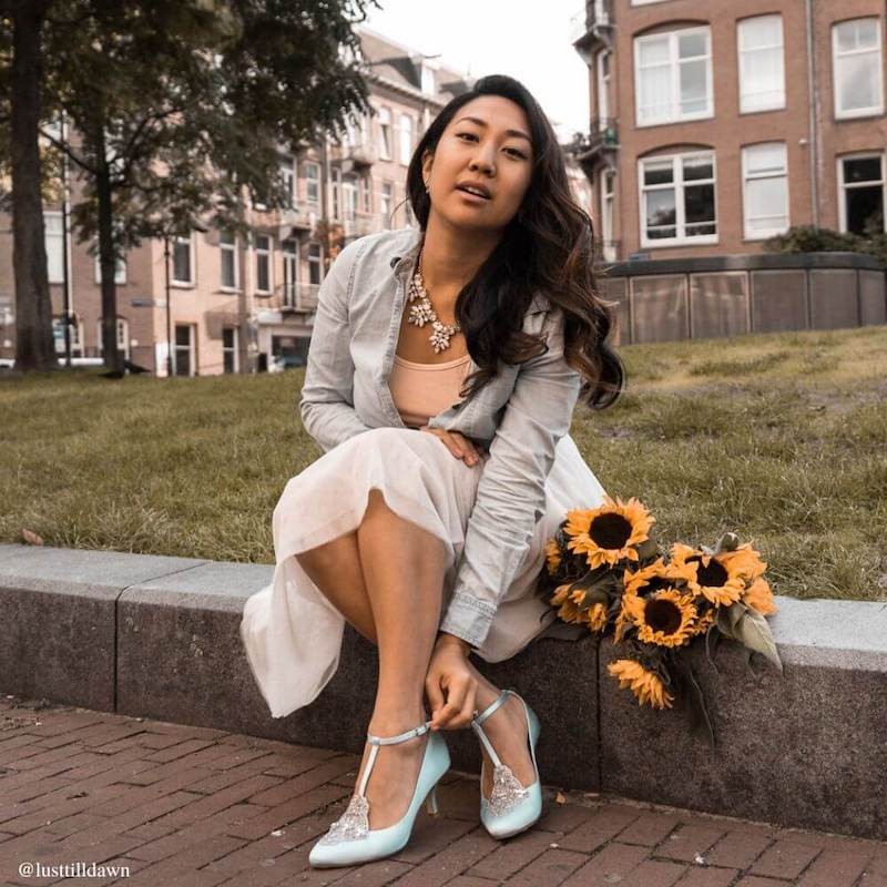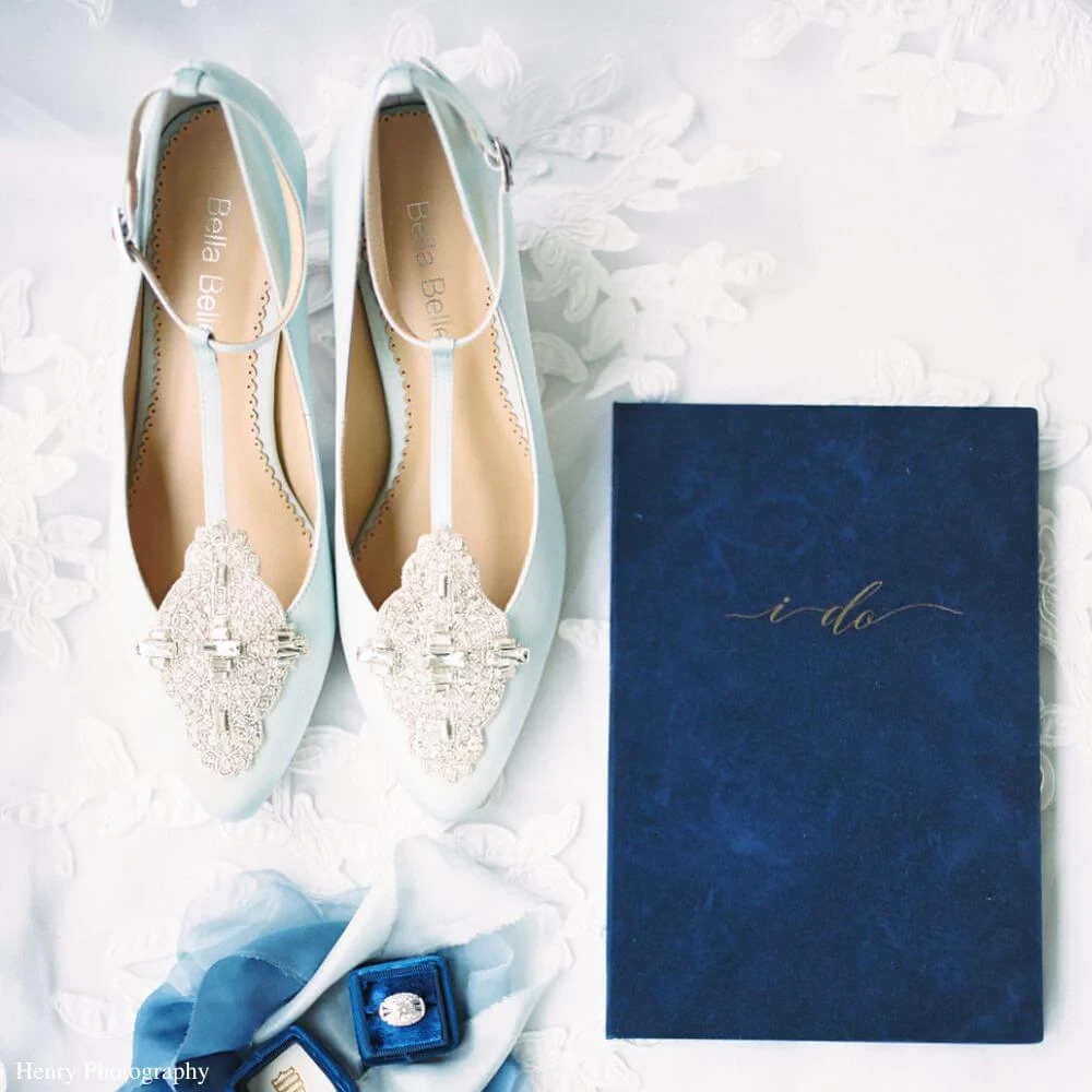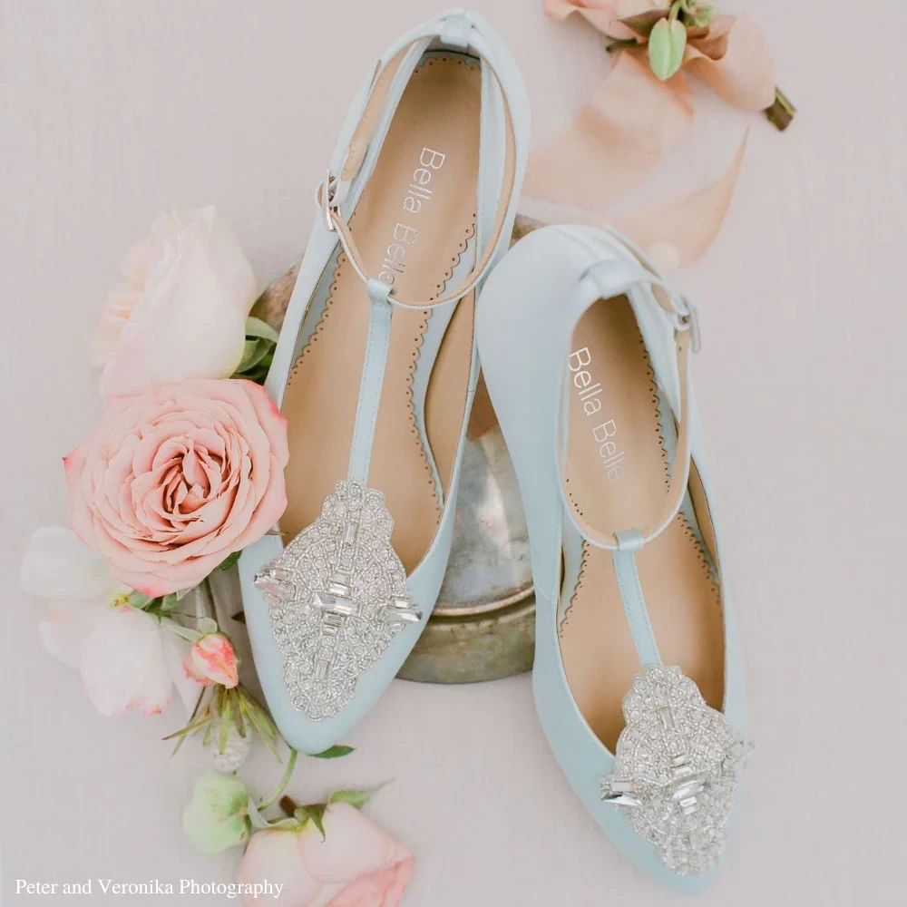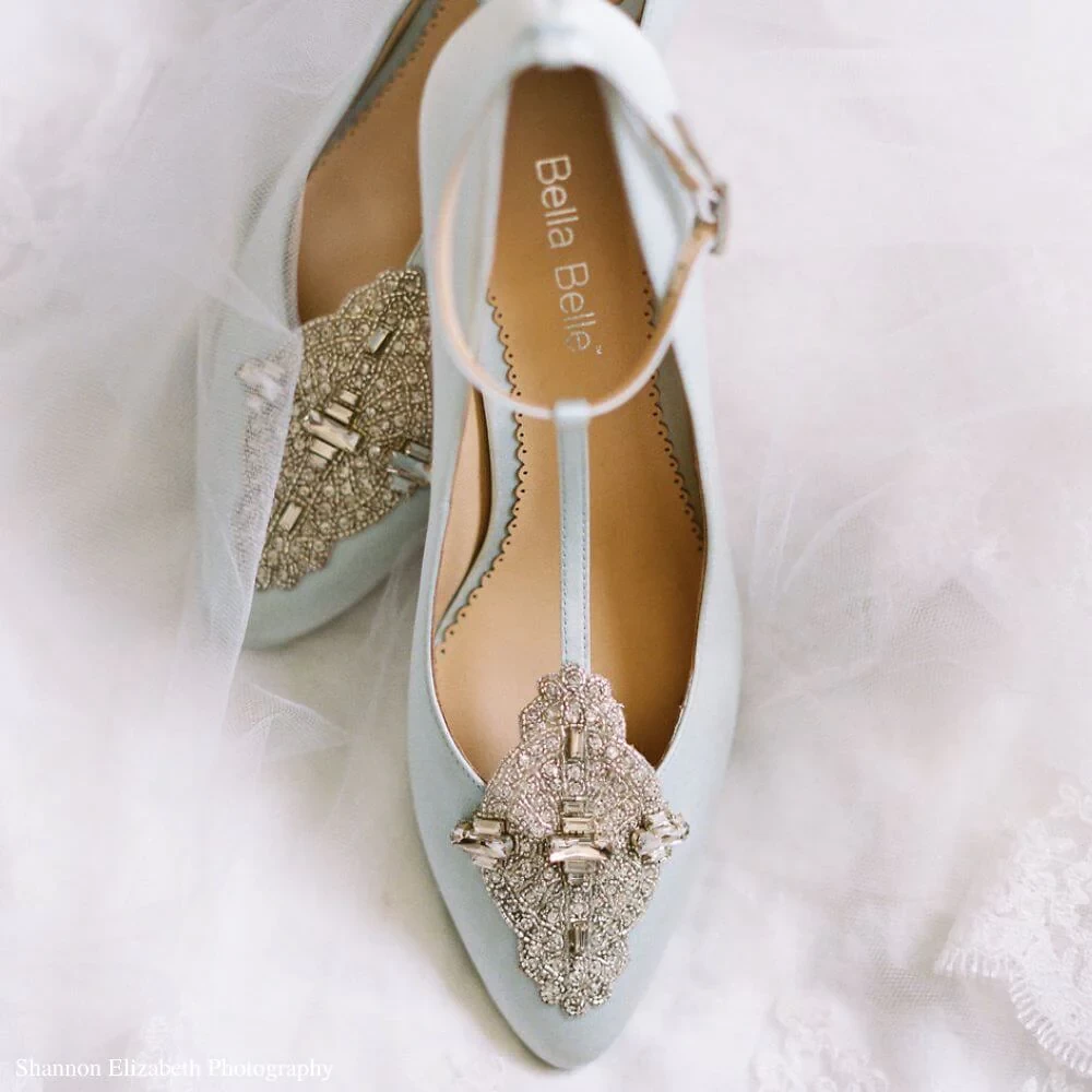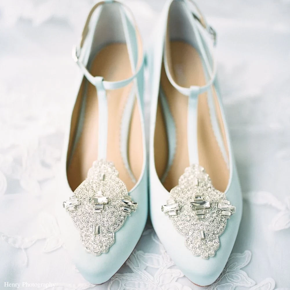 Annalise Blue vintage style wedding shoes are inspired by Great Gatsby glamor. So it's only natural that these blue kitten heel wedding shoes are hand embroidered and beaded with baguette crystals, strings, and glass beads to bring you back to the opulence of that era. The perfect Art Deco wedding shoes.