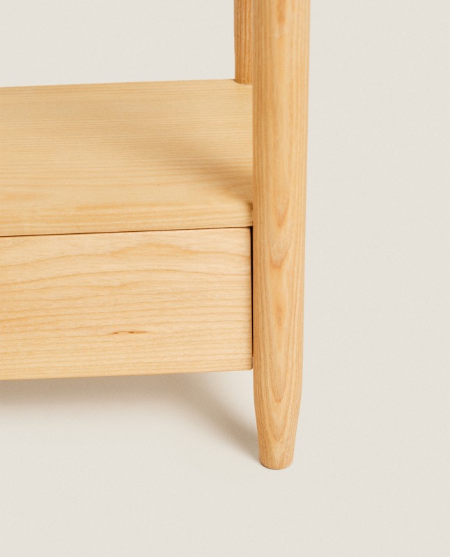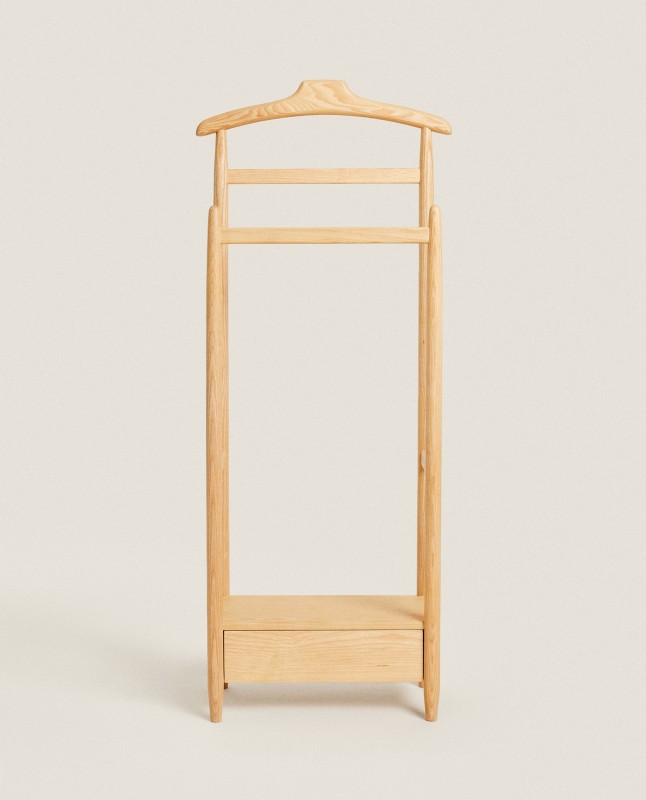 Ash wood valet stand. Made of different sections for organizing your garments. Includes a drawer at the bottom.