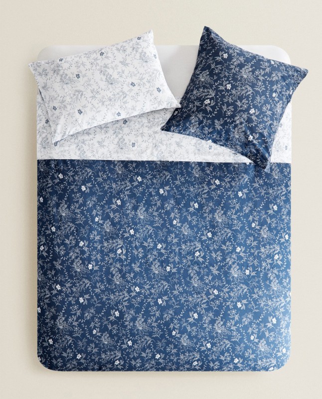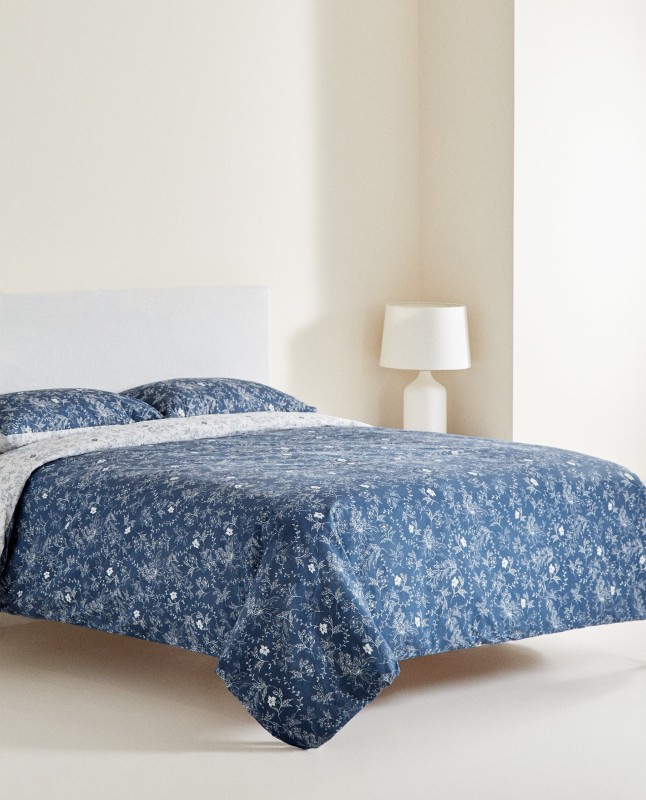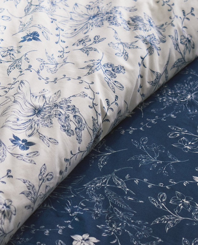 Duvet cover in 200 thread count percale with a blue floral design. Reversible with the same design.