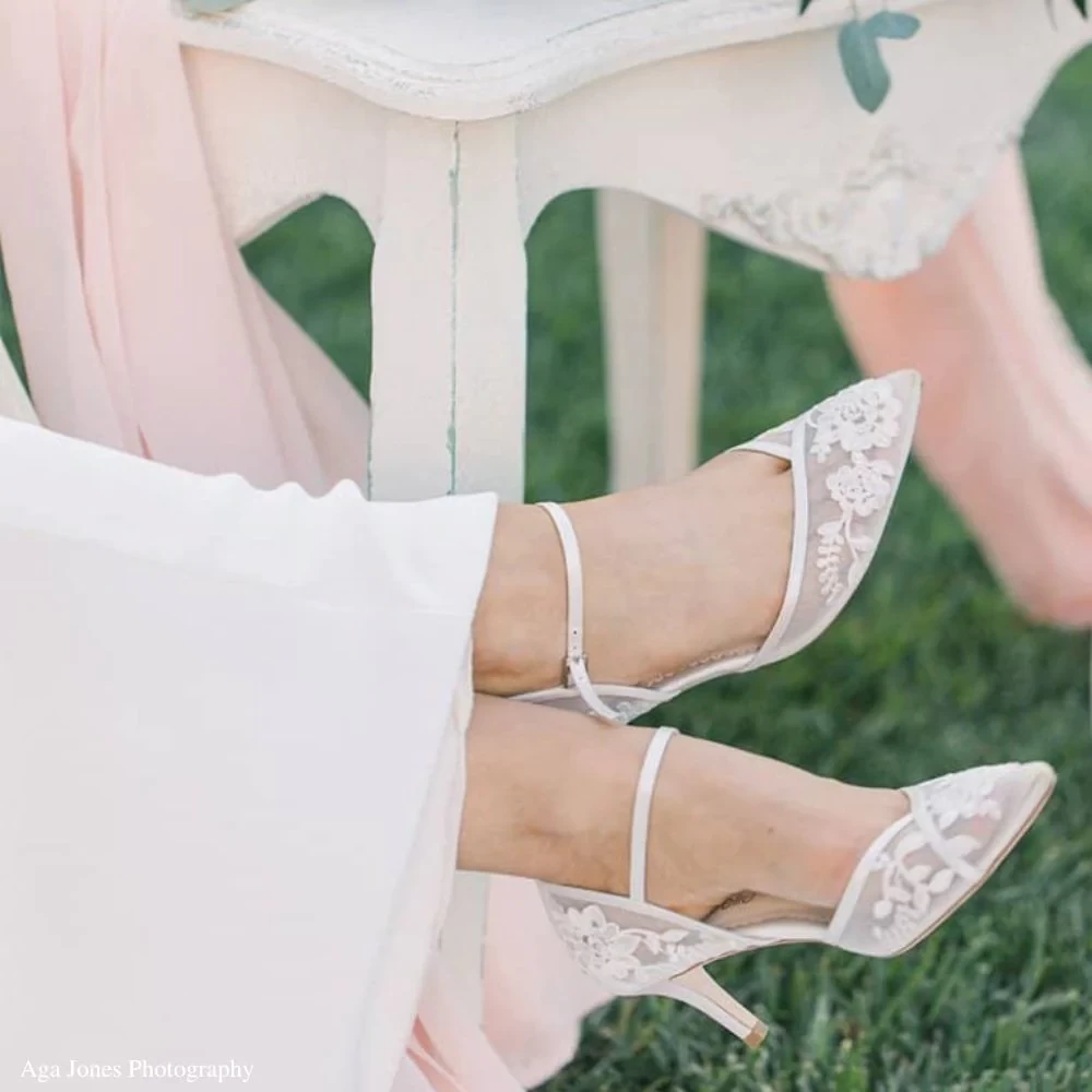 Candice ivory lace wedding shoes feature handmade embroidered baby vines on illusion mesh for a romantic and feminine effect. The d'Orsay shoe shape adds a sexy edge to these ivory vintage shoes. Candice is perfect for anyone seeking a classic, sexy look in a low heel bridal shoe.