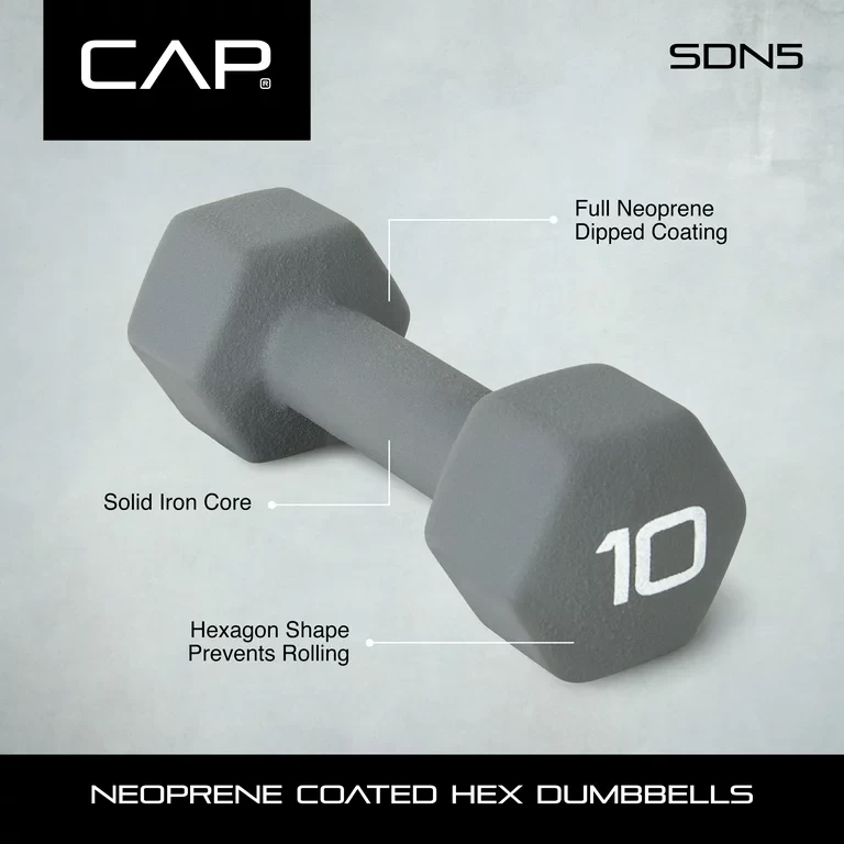 The CAP Barbell Neoprene Dumbbell is a convenient strength training tool for your home, office or gym. The durable cast iron core is covered in a thick neoprene coating to provide a firm and comfortable grip. Dumbbells are used to exercise all major muscle groups, including arms, chest, back, abs, legs and core. The benefits of dumbbell exercises include muscle building, improving core strength, boosting balance, providing better bone health, burning calories, increasing energy levels, enhancing overall mood and more. Dumbbells are perfect for training individual muscle groups or major muscle groups, HIIT workouts and walking. Each dumbbell is sold individually and includes a 30-day manufacturer’s warranty.