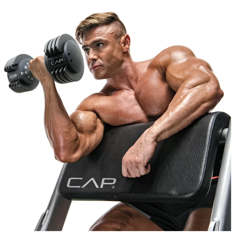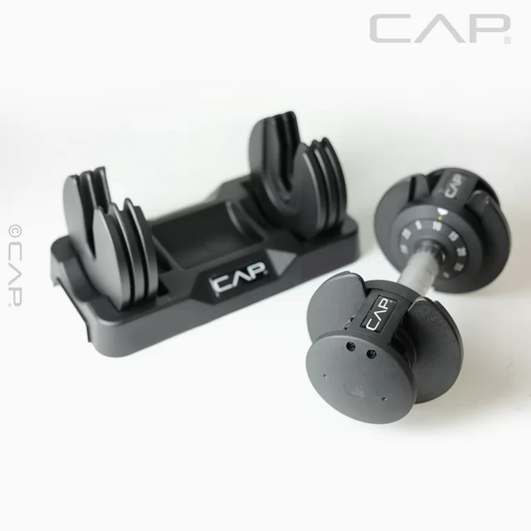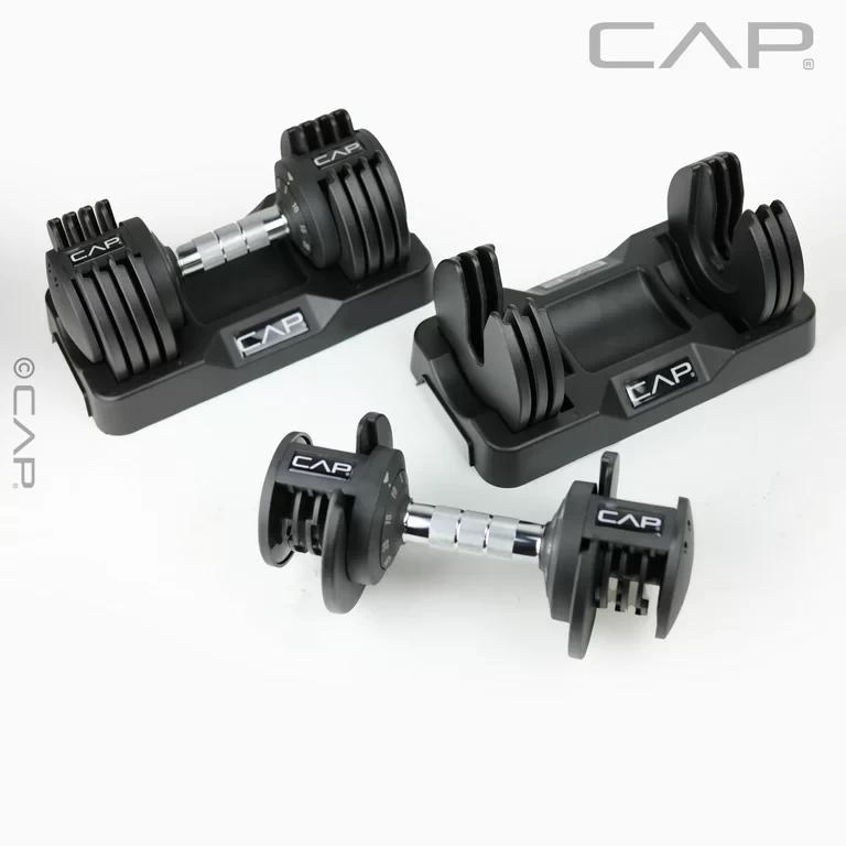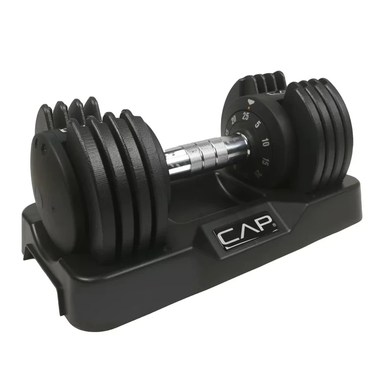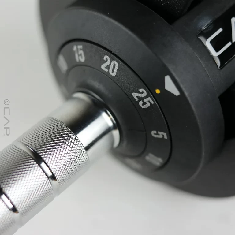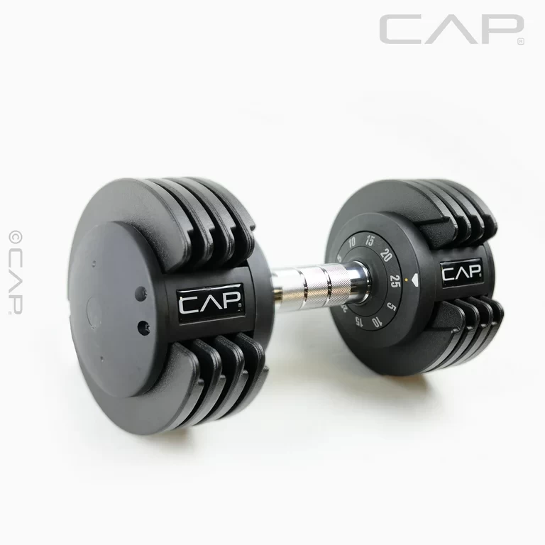 CAP Barbell 25 lb adjustable dumbbell features the adjustable weight adjustment system that is safe, quick, and easy to use. The adjustable weight-adjustment system allows you to rapidly switch from one exercise to the next. Simply turn the handle right or left to adjust the weight in 5-pound increments, pull up, and start your workout. The straight bar handle has a natural orientation for a comfortable, secure lifting position. U.S. Patent 11,285,354