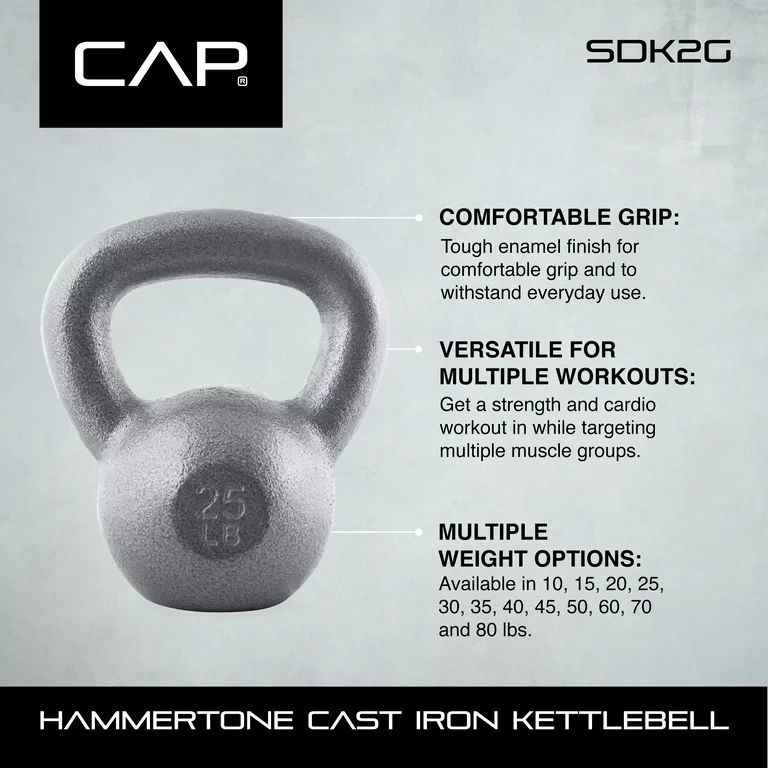 You can improve your strength and endurance with ease using the CAP Barbell Cast Iron Kettlebell. It is designed to strengthen and tone your muscles by lifting and controlling its motion through a variety of prescribed exercises movements. Made from solid cast iron with a tough enamel finish, it is an extremely versatile piece of workout gear that will withstand everyday use. It features a comfortable grip that allows you to switch it from one hand to the other while maintaining your balance and stability. When used with a controlled motion, this CAP Barbell kettlebell will help you get a whole body workout while focusing on specific muscle groups. You can perform bicep curls, triceps extensions and other exercises quickly and efficiently. Give your body a full workout in just a matter a minutes with this kettlebell. Available in a variety of weight sizes.